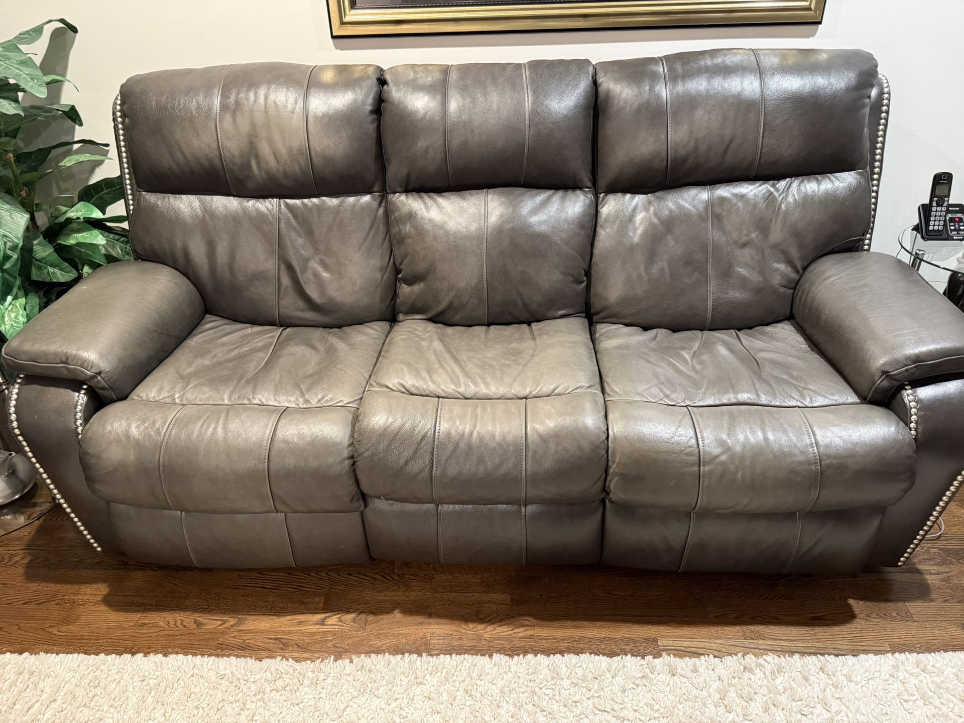 Real brown leather couch and loveseat set. Couch’s end seats recline and have lumbar support controlled by mechanism on each side of couch. Mechanism also includes USB chargers. Both seats on the loveseat also recline, have lumbar support and USB charges. Couch is 88” long and loveseat is 68” both 40” deep.
