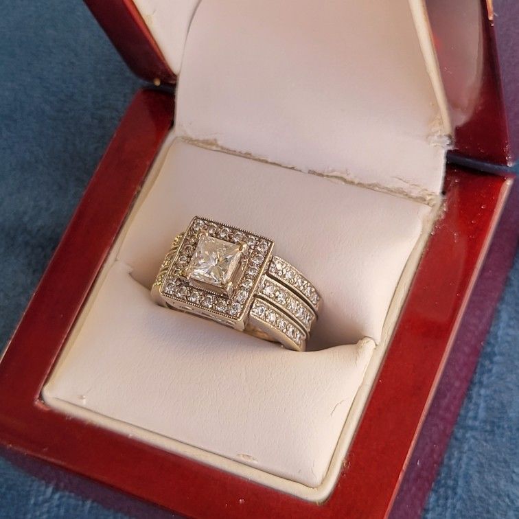 Custom-cast 3 piece (sodered) vintage wedding set. 1.75 total karat weight. Appraised for $7,350. Cash only. Serious inquiries only. Meet up at Connections Fine Jewlery in Tacoma.