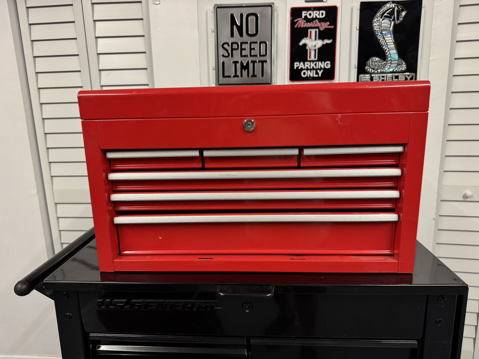 Metal toolbox with 3 small drawers, 2 medium & 1 larger that has broken tracks but still works plus large top storage & nice paint. 23.75” W x 13.75 H x 10” D