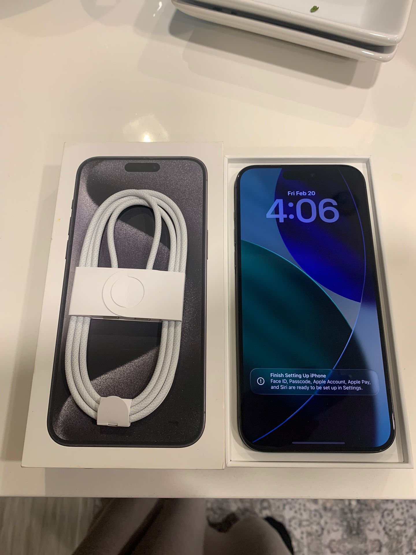 iPhone 15 Pro Max 256GB - Black Titanium (Unlocked) Unlocked for any carrier Great condition no cracks Works great no issues at all Good Battery health Includes original box & brand new charger Will work with: AT&T T-Mobile Sprint Verizon Metro Boost and any other carrier. Also international Bring your SIM card and test it before you buy :)