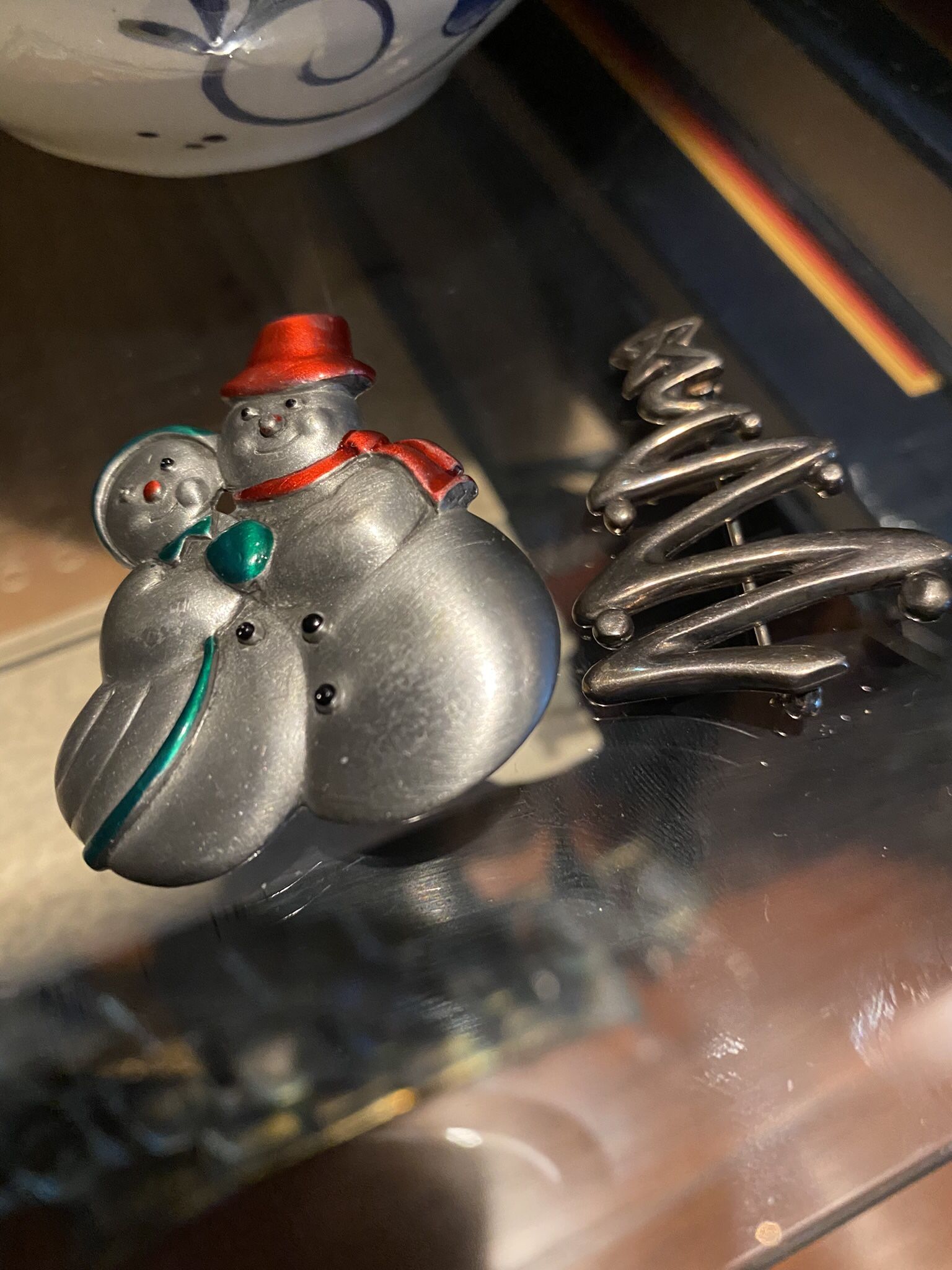 Beautiful Christmas Stearling Silver Christmas Tree and Snow Man and Snow Woman Winter Pin Brooch. 25 dollars each. Like New