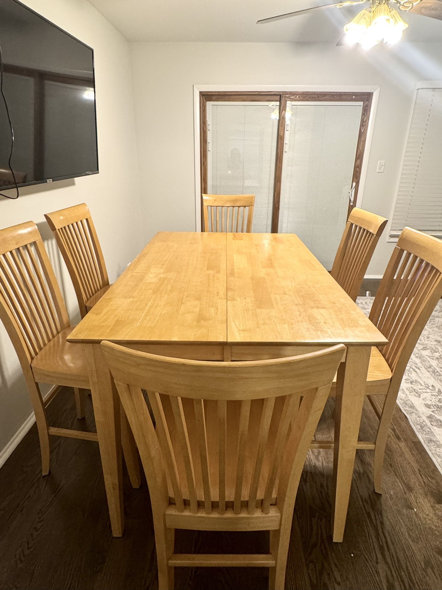 Counter height sturdy wood dining set for 6 in great condition. Table extends to a bigger square table. Smoke free, pet free clean home. Moving sale, please see my other posts.