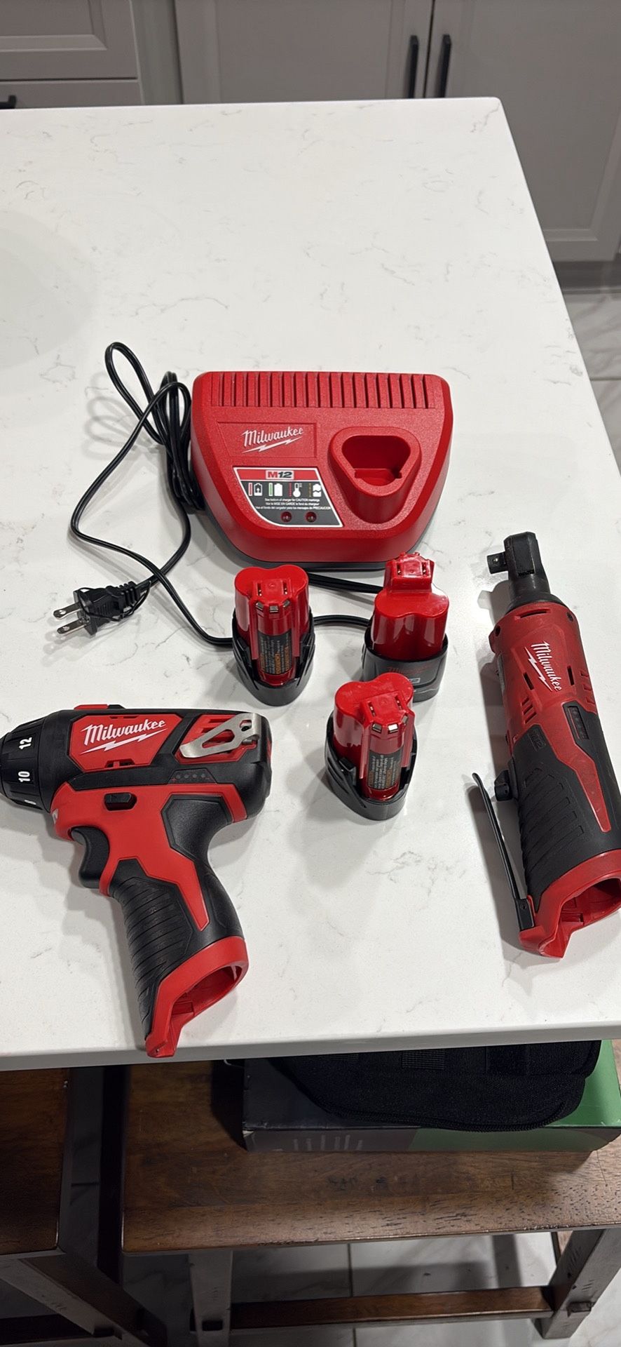 Milwaukee drill driver 3/8 ratchet charger and three batteries 1 1.5 and 2 2.0 batteries