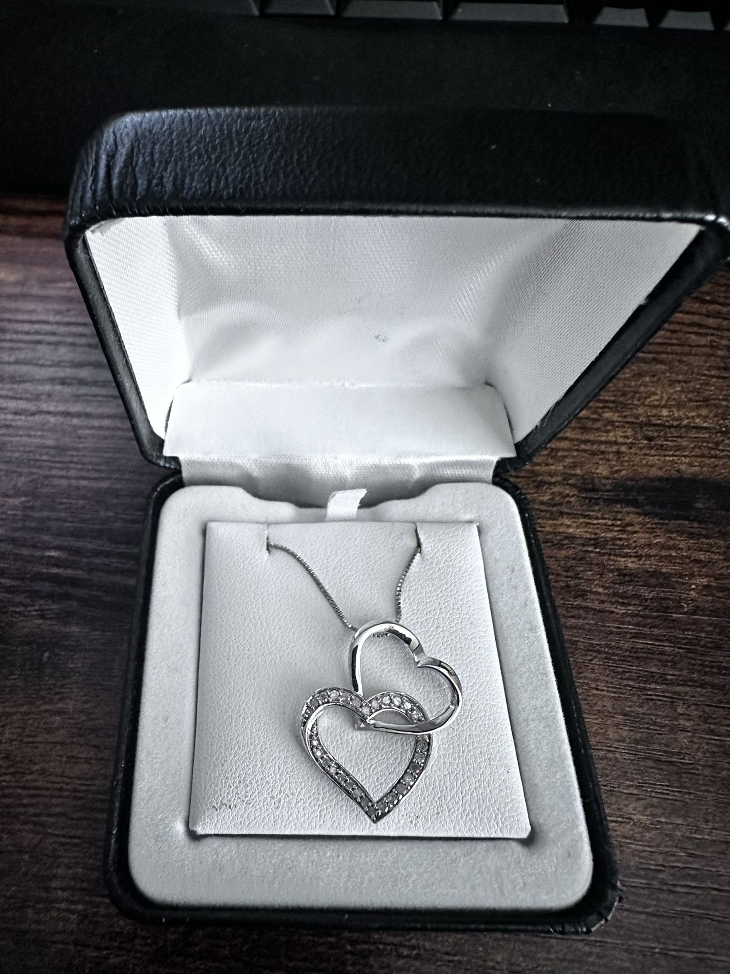 Never worn 1/4CTTW diamond and sterling silver necklace. Two Hearts Forever One.