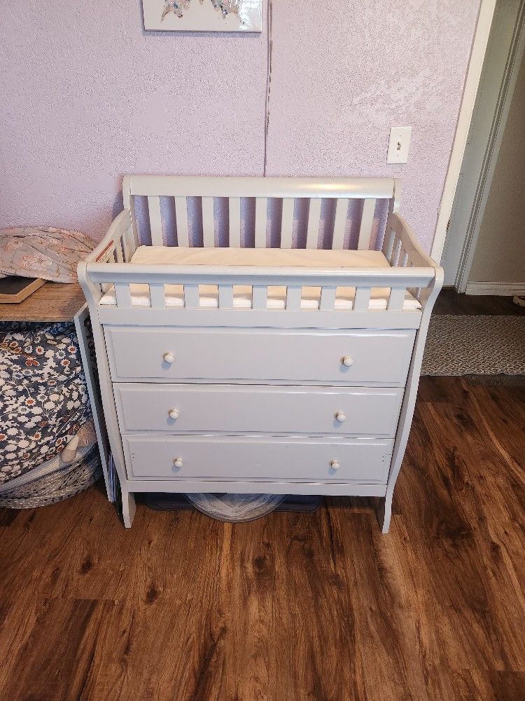 Delta Children light Grey 3 drawer dresser with changing table on top. Bottom drawer was refurbished. H 38in x W 36in x Depth 22in