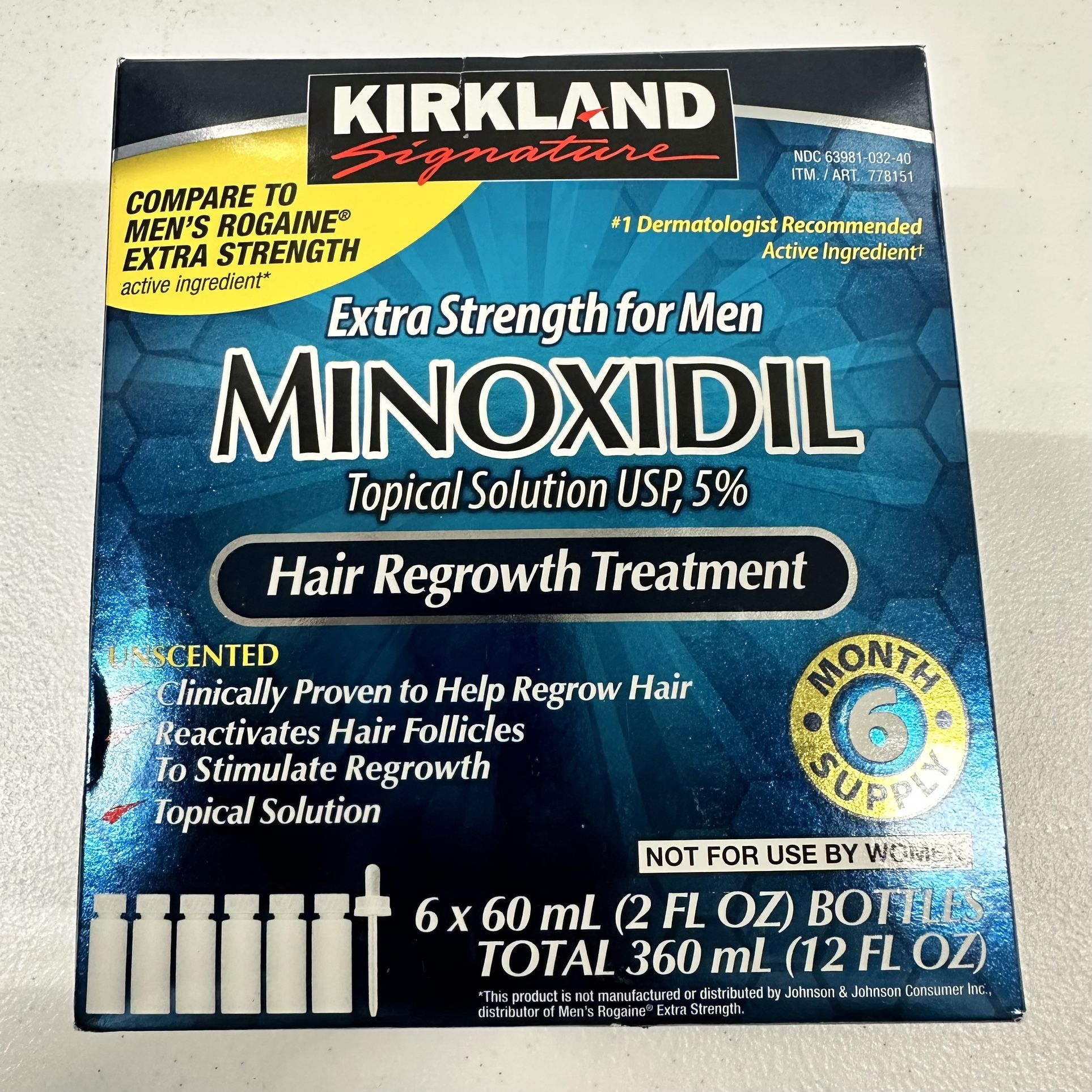 Kirkland Signature Minoxidil 5% - Extra Strength Hair Regrowth Treatment for Men (6-Month Supply) • I have 6 boxes available, all brand new and unopened. • Each box includes 6 bottles (60 mL / 2 fl oz each) for a total of 360 mL. • Topical solution clinically proven to help regrow hair and reactivate hair follicles. • Extra Strength formula (5% Minoxidil), comparable to Men’s Rogaine Extra Strength. • Unscented and easy to use. • Expiration date: February 2025. Note: Not for use by women. While products like this may still work after expiration, the effectiveness can decrease over time. For best results, it’s recommended to use them before the expiration date. También hablo español y entrego en Tijuana.