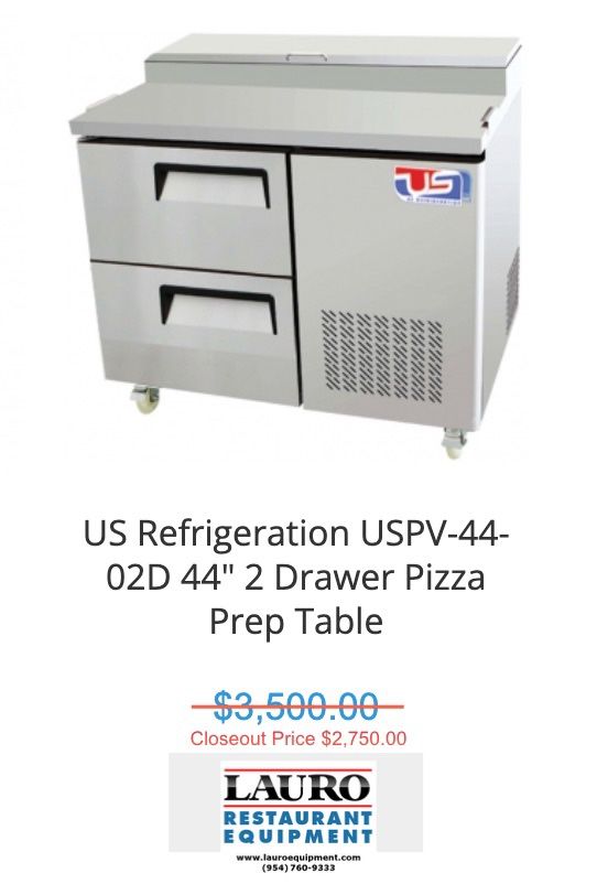 New US Refrigeration USPV-44-02D 44” 2 Drawer Pizza Prep Table on Casters Visit our 25k sf showroom located at 1224 NE 7th Ave. Fort Lauderdale, FL 33304 Monday-Friday 9am-4pm where we sell new and used restaurant equipment & furniture. We are direct importers and have a huge inventory of new restaurant equipment in stock. We offer financing / lease to own with fast approvals directly from our website www lauroequipment com