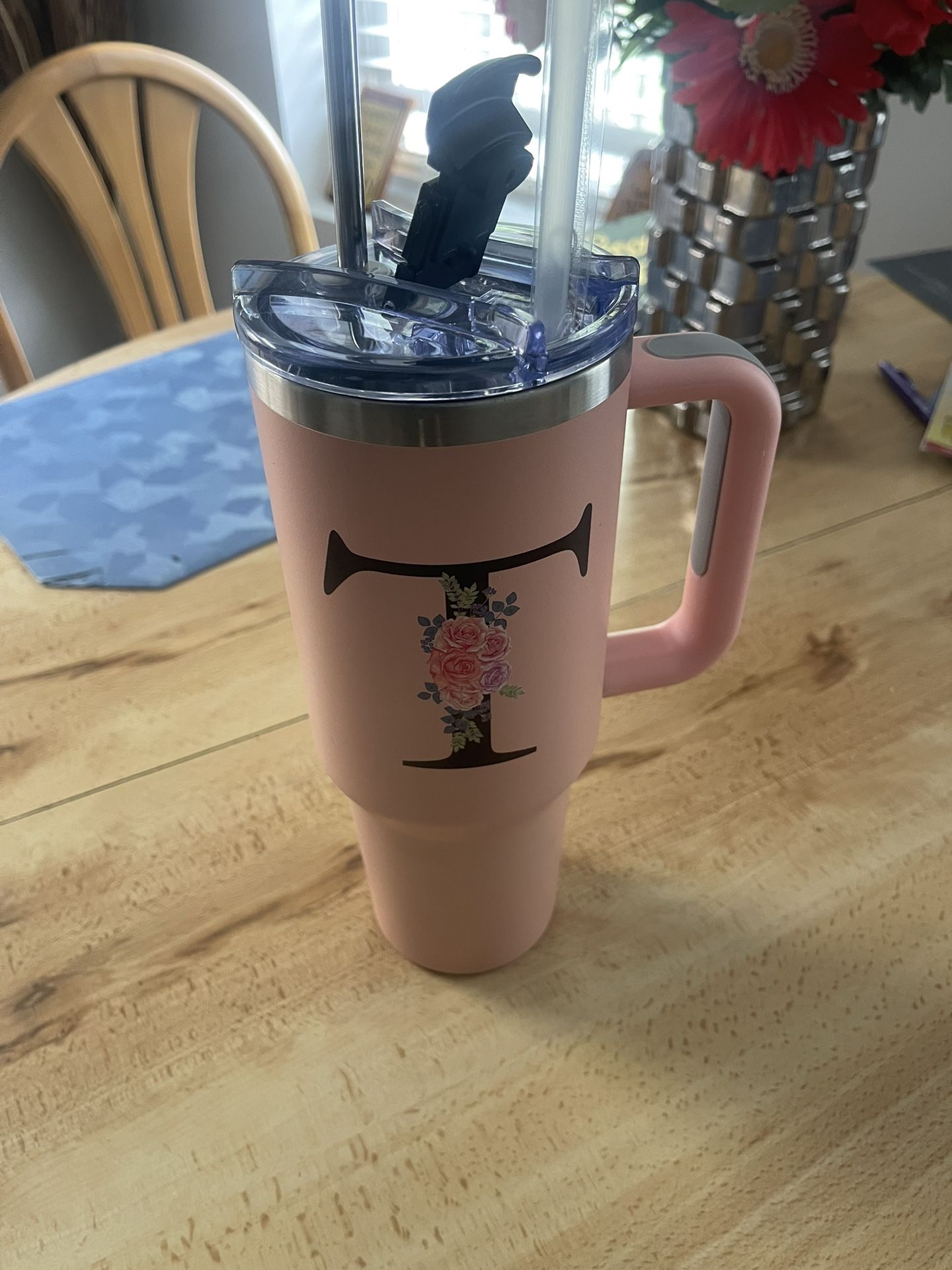 Pink rose 40 oz tumbler with straw,lid,cleaning supplies, and extra accessories