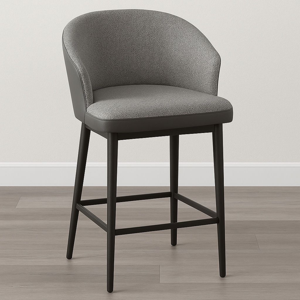 Simple and modern gray upholstered bar stool with a curved back and black wooden legs. It shows some noticeable wear on the fabric, but it’s still very sturdy and comfortable — perfect if you just need stools for your counter, vanity, or workspace without breaking the bank.