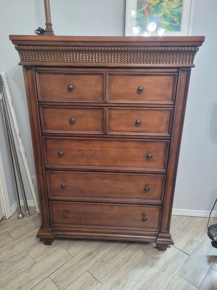 Dresser and nightstand. Windward Bay by Riverside Furniture, originally purchased from Hudsons. Solid wood, made in Vietnam. Barely used, excellent condition. Dresser is 56.5 H x 40 W x 18 deep. Nightstand is 29 H x 28 W x 17 deep. Both pieces have felt-lined drawers, bottom cedar drawer and top hidden drawer that looks like decorative trim. Beautiful detail, high quality. Local pickup only. Eager to sell!