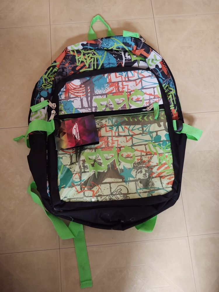 Backpack by Trail maker Brand new Spacious main compartment Durable polyester fabrication Front pocket with tinted pvc Side compression straps Padded back panel Padded shoulder strap