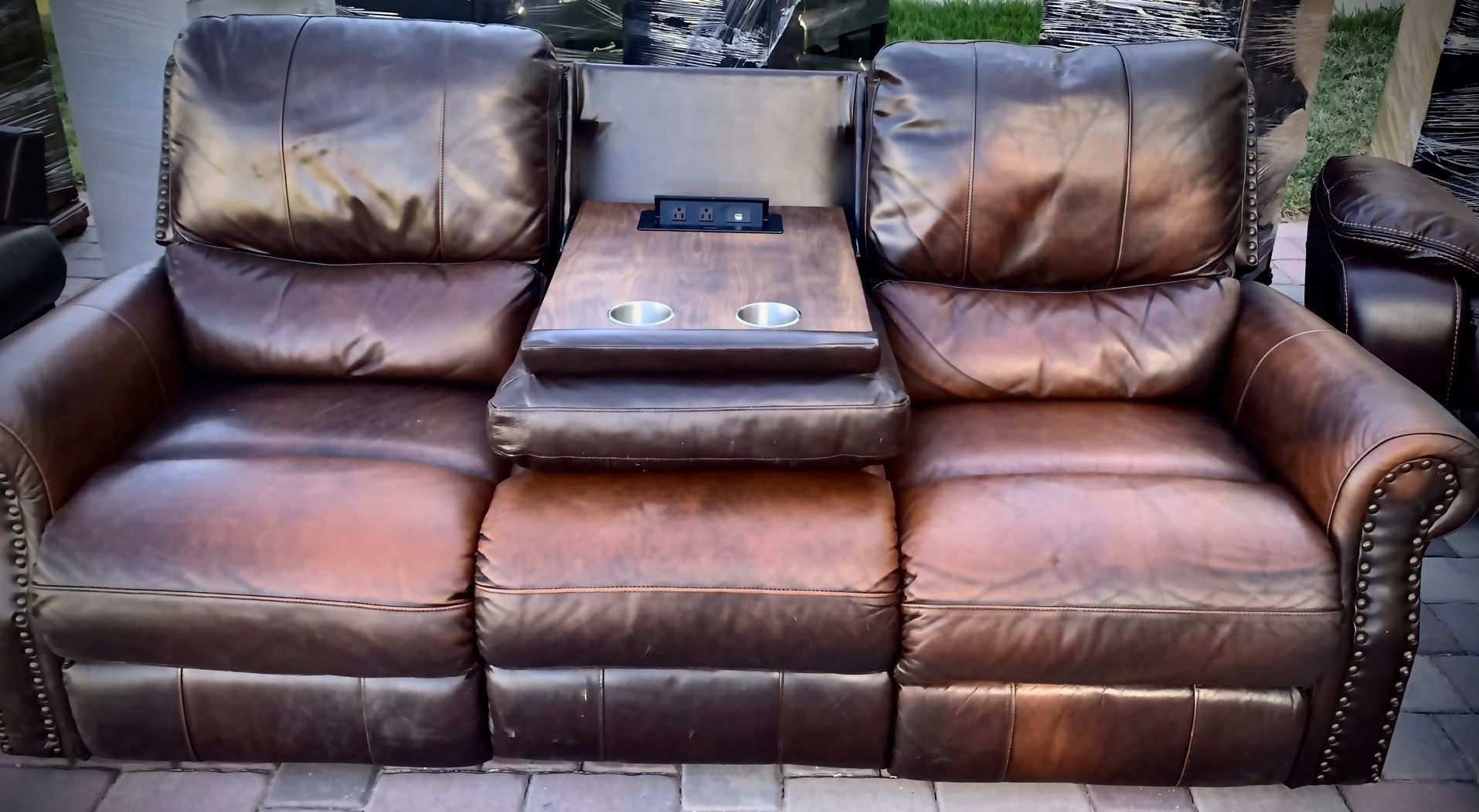 Burgundy color leather couch and recliner. The recliner does lean by where you sit and recline, nothing noticeable while you’re sitting. Can be easily fixed, doesn’t interfere with the function of the recliner.