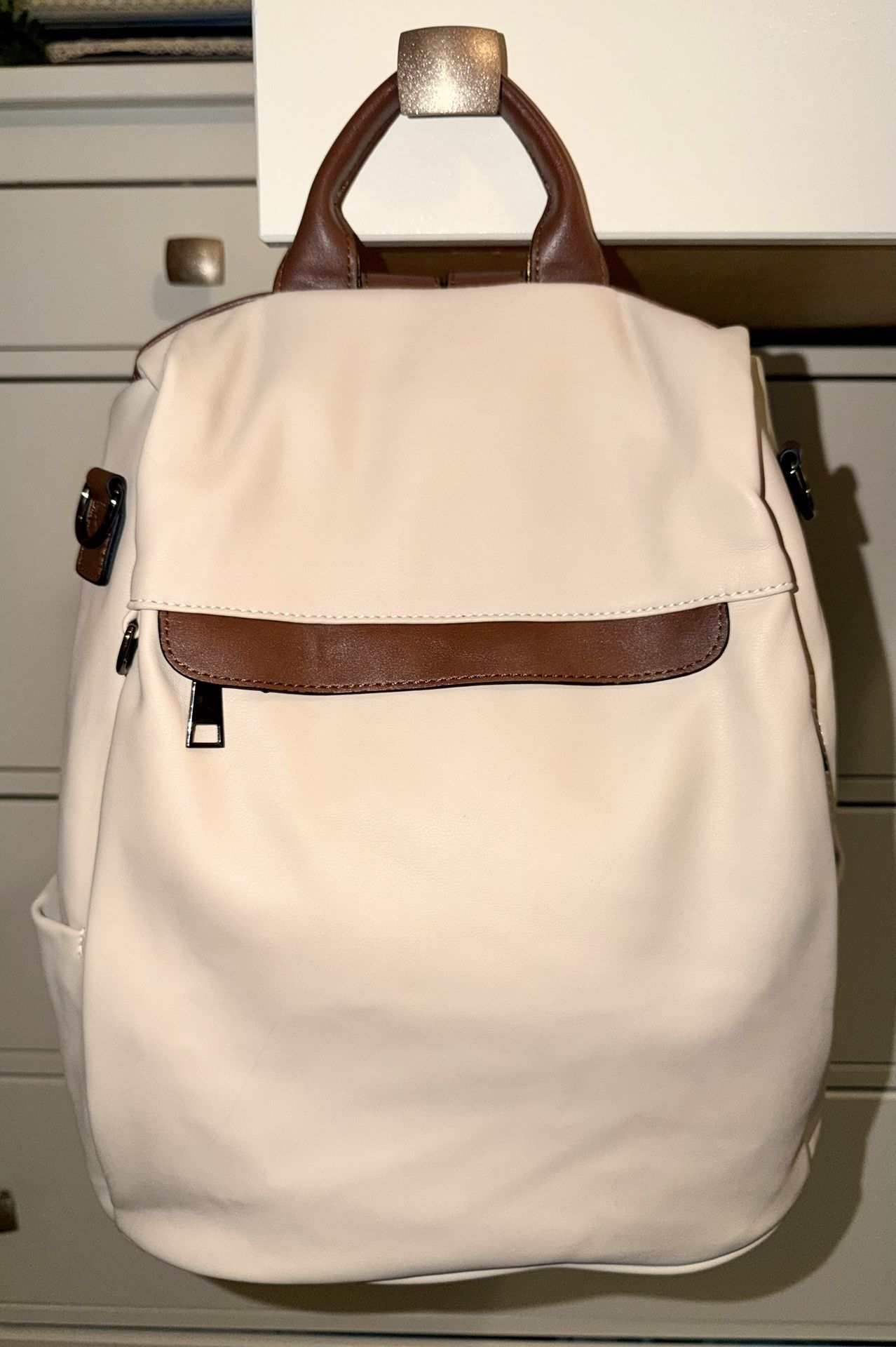 Beige & Brown backpack with a large/main Anti-theft pocket (zips open from the back). Has Inner pockets. Also Has One Small outer front pocket & two small side zipper pockets. Gently used, In great condition.