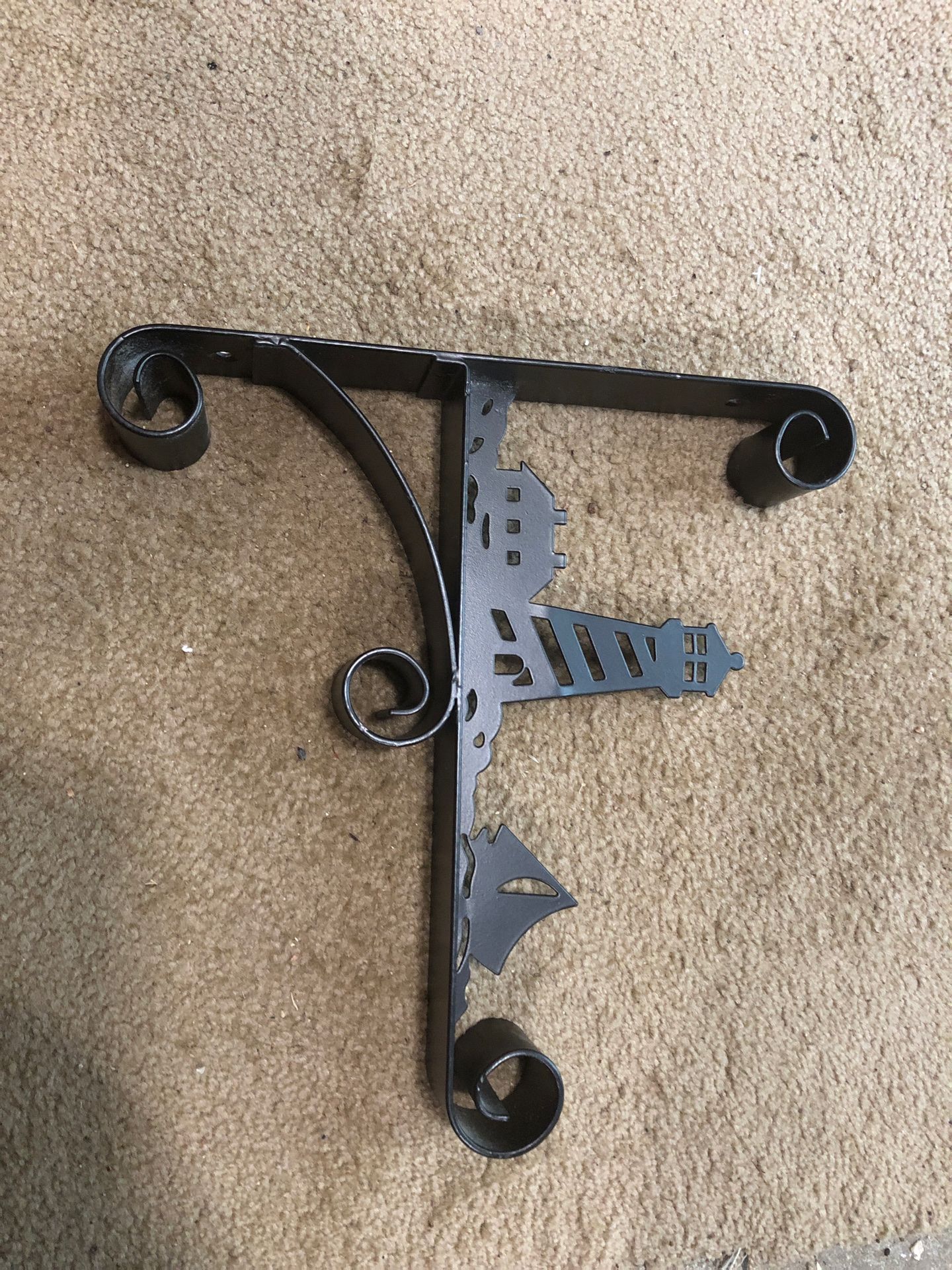 Steel corbal with a lighthouse. Strong enough to hang a plant from it. 9.5 inches high and 9.5 inches long. Perfect for the lighthouse lover in your house.
