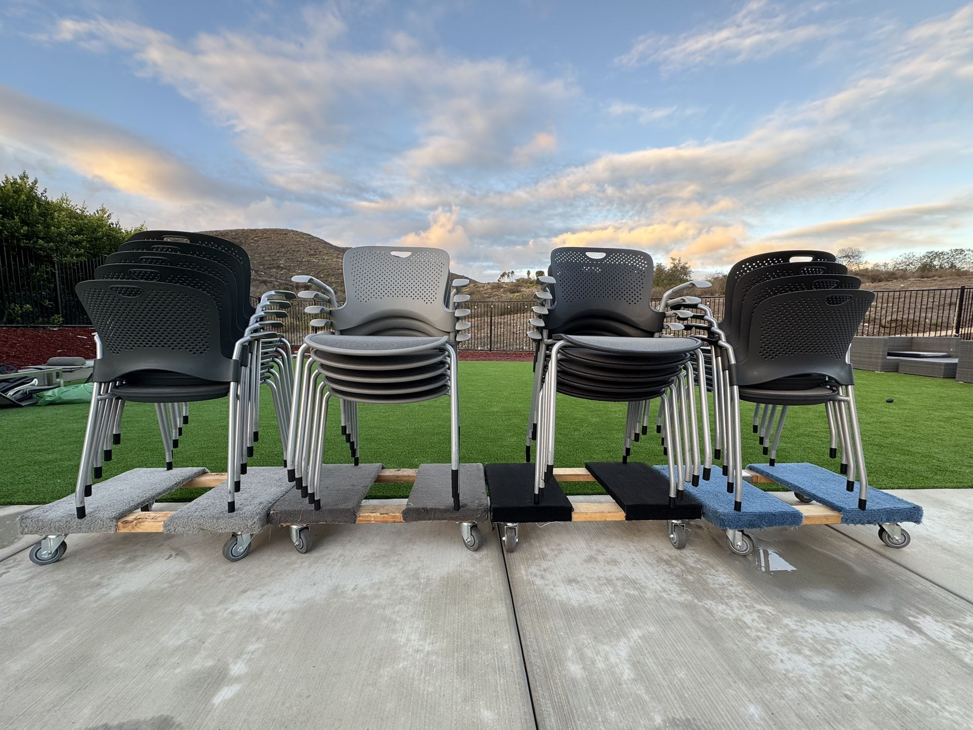 In good condition, very clean. Mesh seat, stackable, multiple color, everything works well! $100 each,40 available! •dark green back with light gray arm pads, 21 available •middle gray back with light gray arm pads, 5 available •dark gray back with light gray arm pads, 5 available •dark gray back with black arm pads, 4 available •blue back with black arm pads, 4 available