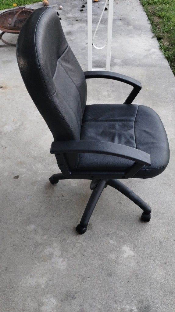 -Black faux leather fixed-height office chair swivels 360 degrees for effortless use. -Desk chair features armrests and foam padding providing support and comfort. -Office chair also features 5 wheels enabling easy mobility. -Dimenaions: Total Height: 41.5 inch Total Width: 26 inch -Please see last photo for additional dimensions.