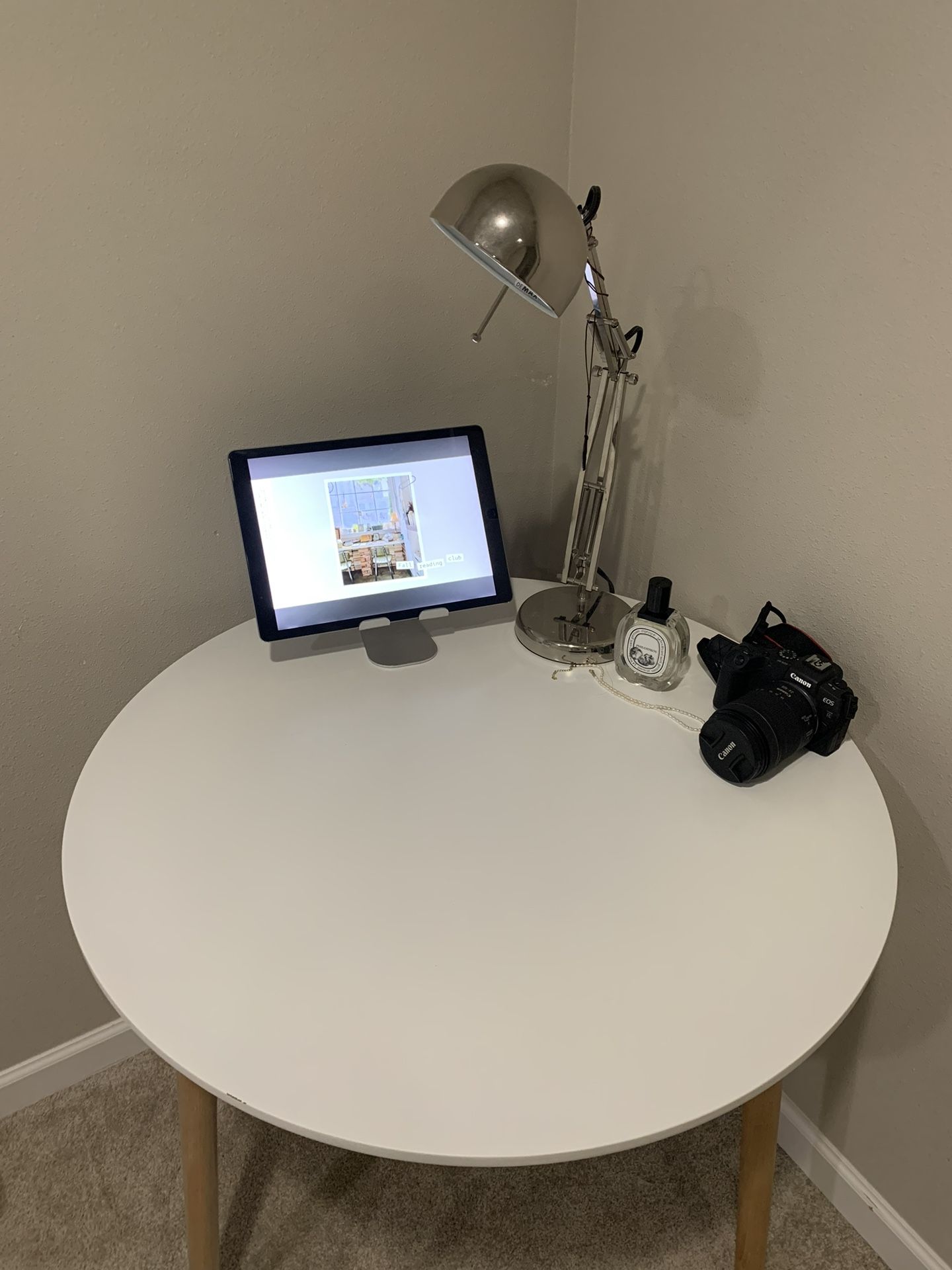 white table Good for dining and office table Selling because it's too small for our new house! Little stain and scratch on the table