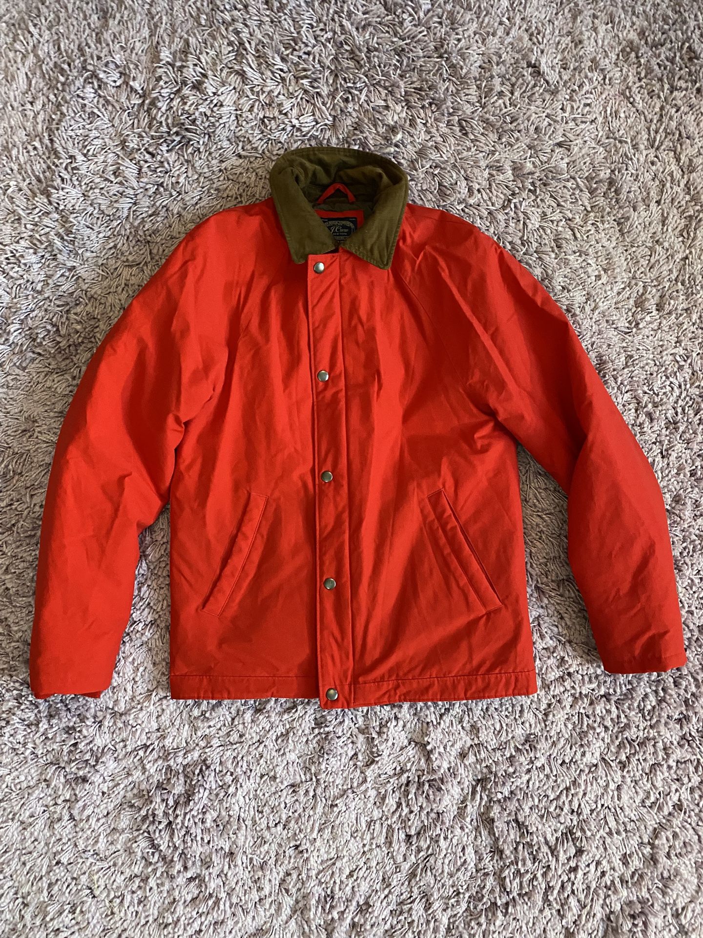 Barn coat or parka style jacket insulated with “primaloft”. Worn a couple seasons and is in great condition. Super warm and cozy. Size XS Our designers built this jacket to take you anywhere, whether that's a cabin upstate or a city commute. It features a water-resistant cotton-nylon shell, lightweight PrimaLoft insulation made entirely from plastic bottles, fleece-lined pockets and a contrast corduroy collar. 60% organic cotton/40% recycled polyamide.