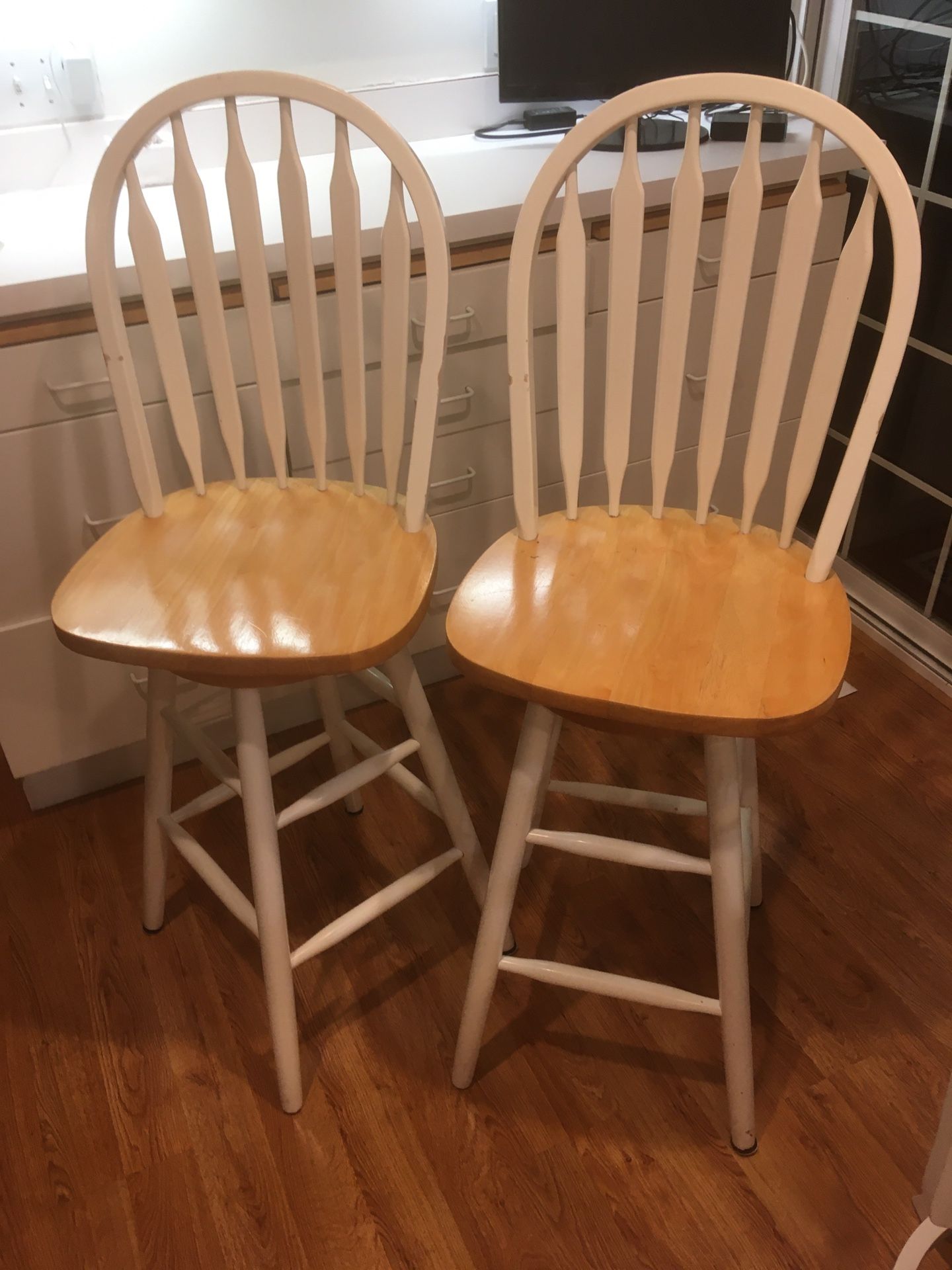 Two natural wood and White swivel barstools. In good condition but normal wear as shown in photos. Missing 1 and 2 floor glides respectively, but those can be replaced easily. 30” seat height is better for bar height counters, but may be OK (or even preferable) with standard 39” kitchen counters for kids or short adults. At 6’3” these seemed a bit tall for eating at a 39” counter (Kind of like putting a couch cushion on your lap and a TV tray on top of that.)