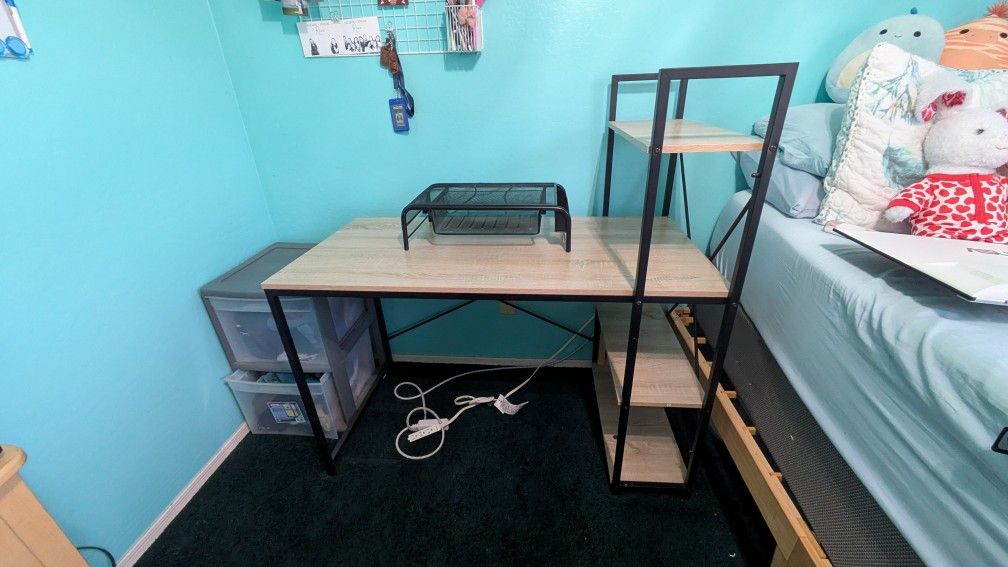 Light wood color sturdy clean came out of the box with a chipped corner but it didn't bother me or affect the functionality of the desk. It has 3 shelves and is also reversible I'm slow giving the monitor riser and the plastic side table with it if wanted . Light weight. Willing to deliver but that's an extra cost on top of the 30.