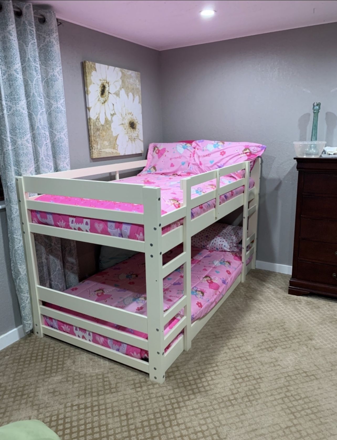 Dimensions: 48” H x 44” D x 78” L, Twin beds support up to 200 Ibs. each No box spring required, Bunkie board recommended; 5”- 9” mattress thickness recommended BRAND NEW IN BOX