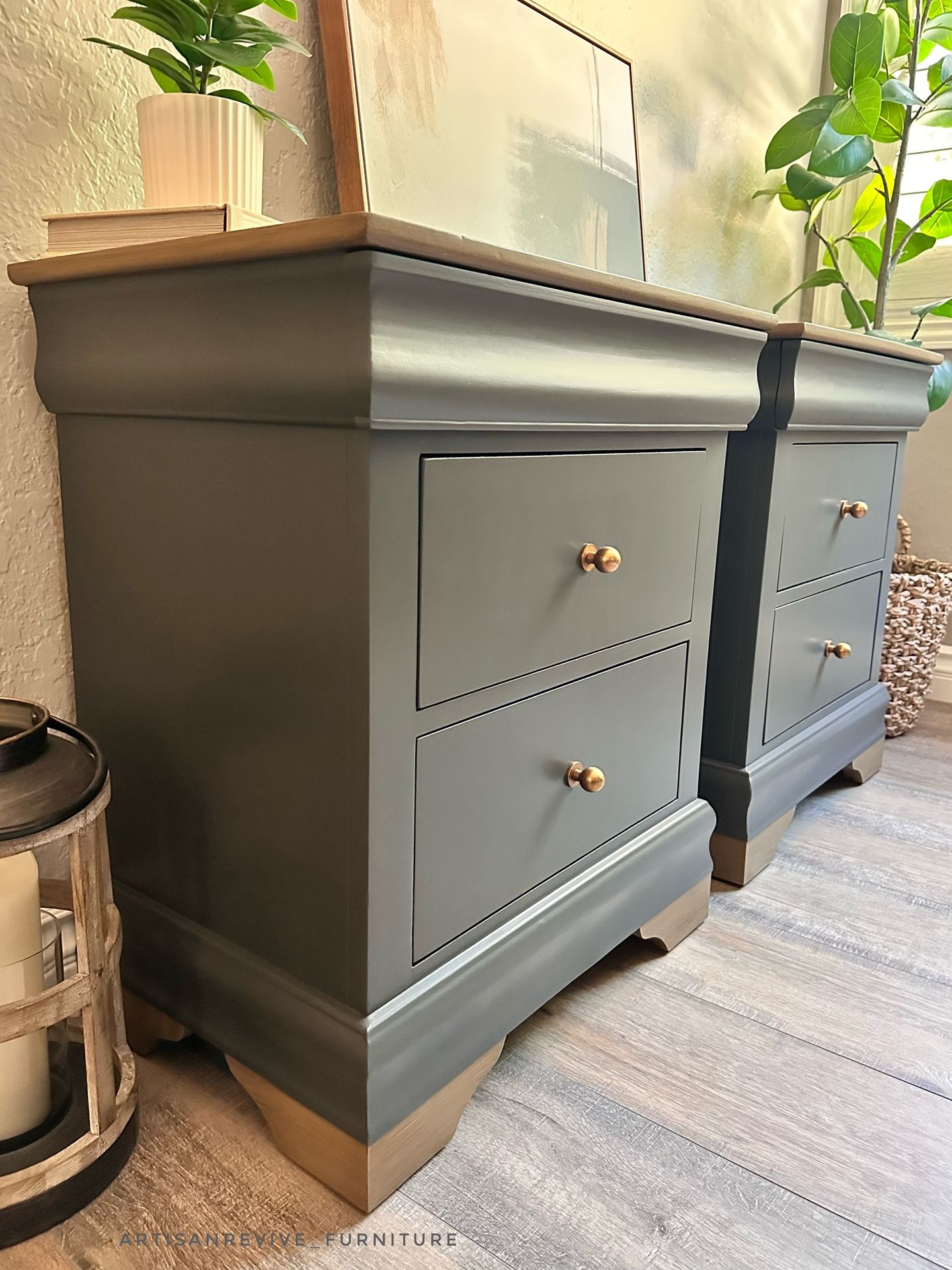 Refinished nightstand set (Sold as pair) -Deep charcoal gray (one shade away from black) quality furniture paint -Faux-finished top and feet sealed in Matte topcoat -3 drawers each on center mount wood glider-smooth sliding (one hidden drawer) -new brass knobs -new drawer liner -freshly sanded, repairs, primer, durable furniture paint -smooth feel like-new -quality wood construction 24” Wide 27 1/4” Height 16”Depth *Comes with furniture care kit Pick up Chino Hills Cash or Zelle accepted at pick up Accessories not included All sales final