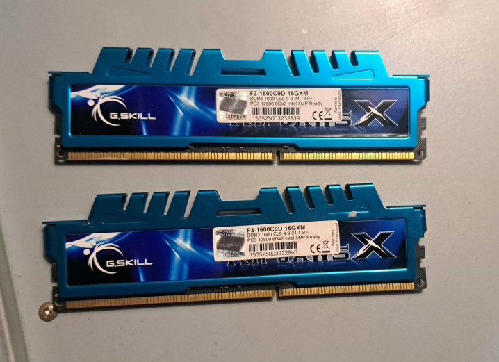 (model F3-1600C9D-16GXM). Total Capacity: 16GB (2 x 8GB modules). Speed: DDR3-1600 MHz (PC3-12800). Latency: CL9-9-9-24 at 1.50V. Features: Features blue aluminum heat spreaders and Intel XMP ready functionality.