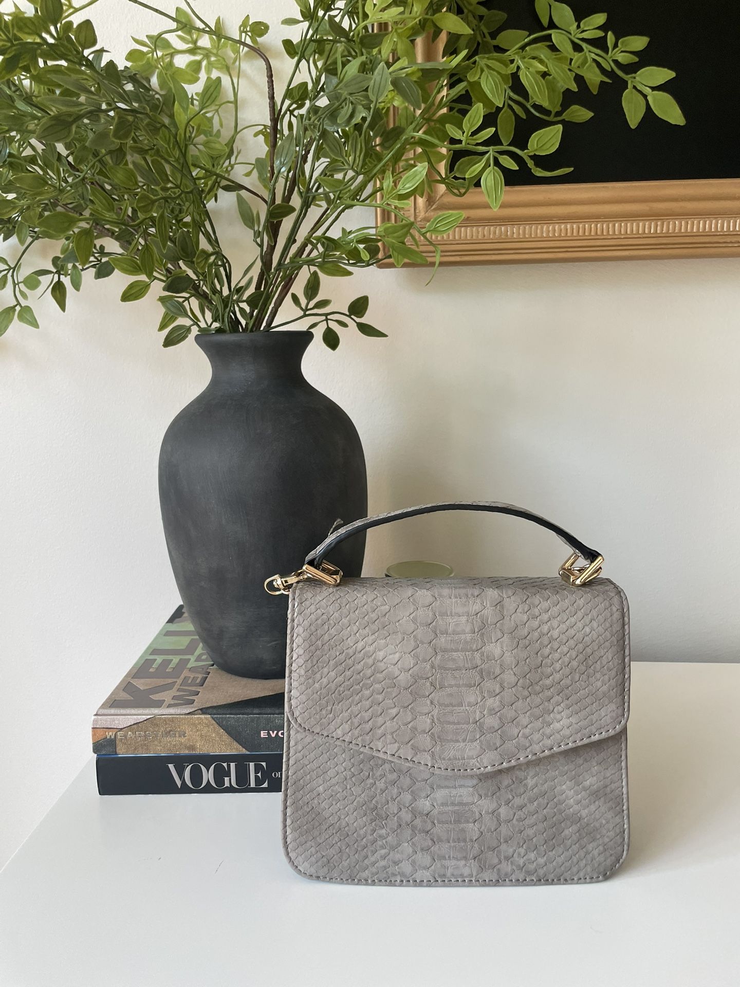 This stylish gray handbag features a chic snake print design, perfect for any occasion. Its elegant look adds a touch of sophistication to your outfit. Button closure 1 zipper pocket inside 1 open pocket inside Cross body strap is removable Used lightly twice Great condition 8” wide x 7.5” high Pick up near Oracle Park