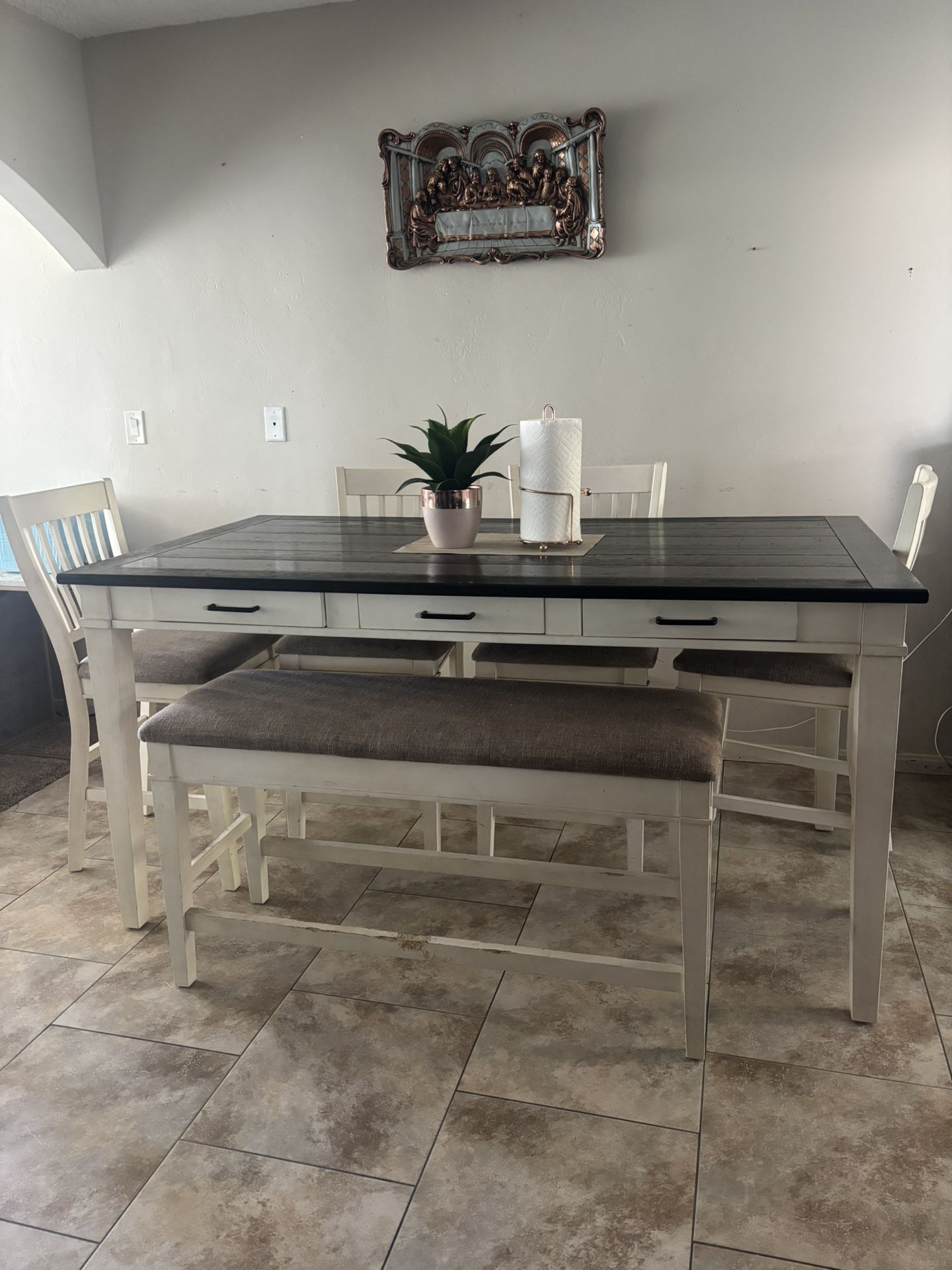 Montana 6 Piece White & Beige Upholstered Counter Height Dining Set with Storage Bench…needs cleaning