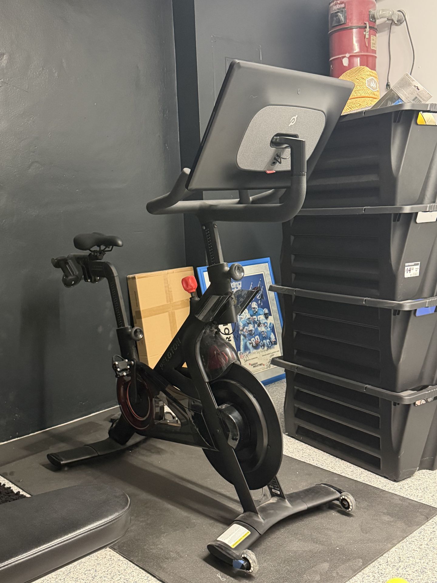 The bike is pristine with a large screen that swivels. 2lbs weights are included along with the peloton mat for underneath the bike.