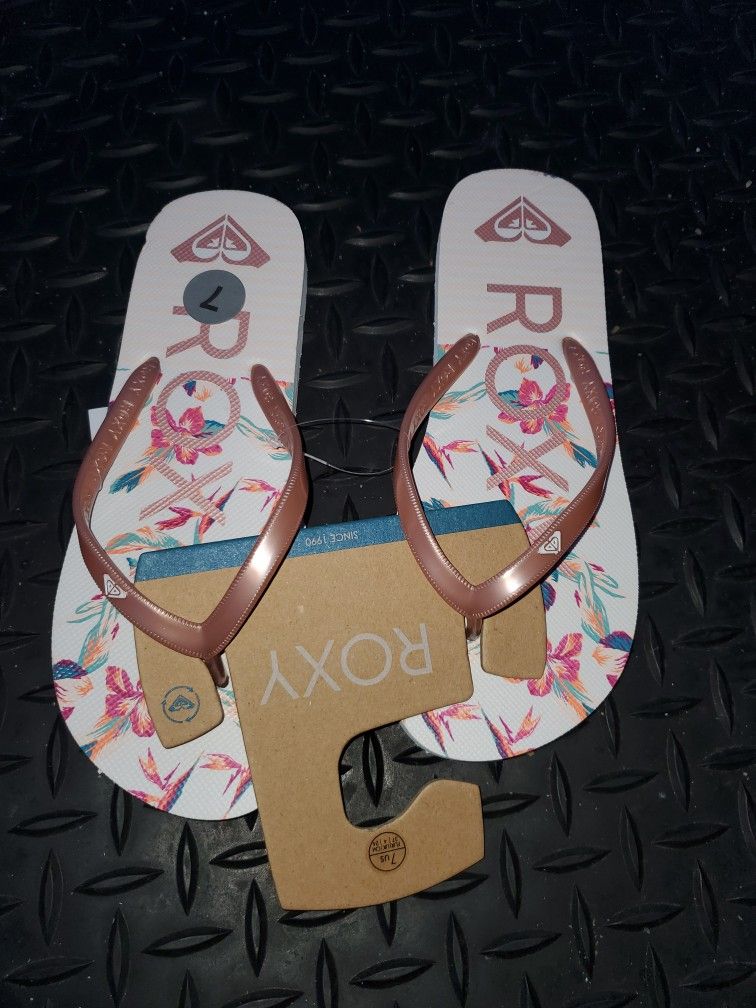 Roxy flip flop white with birds of paradise print at upper to middle of insole & stripes across the bottom. Rose Goldy strap. New never worn. No known flaws. Tags attached.