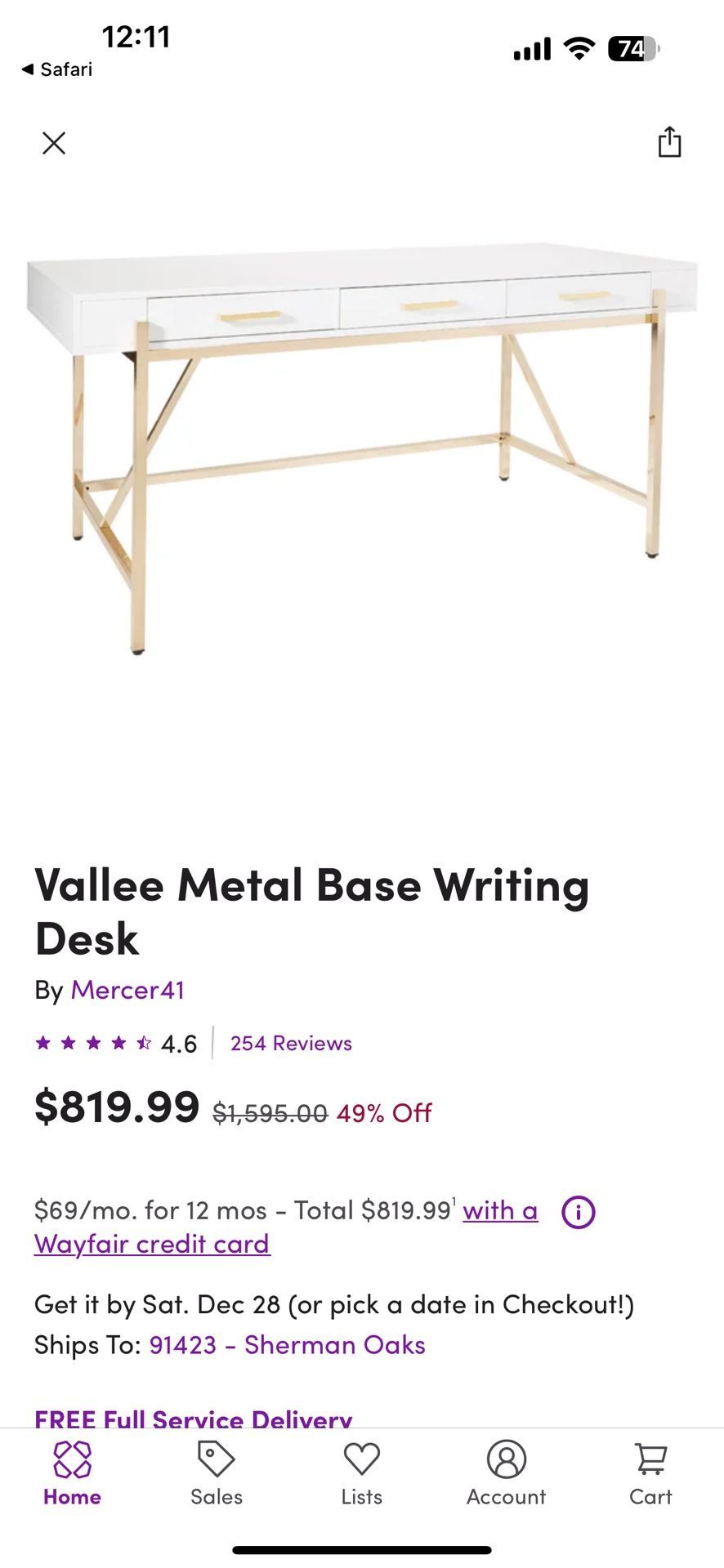 29.5 in H 65 in. W X 28 in D Modern white desk with gold hardware and accents. 3 drawers that pull out all the way, one has power/usb outlet. Small damage- see photo PICK UP ONLY - MUST BE ABLE TO MOVE YOURSELF Easy to put together/dis-assemble legs if needed. Bought from Wayfair for $800