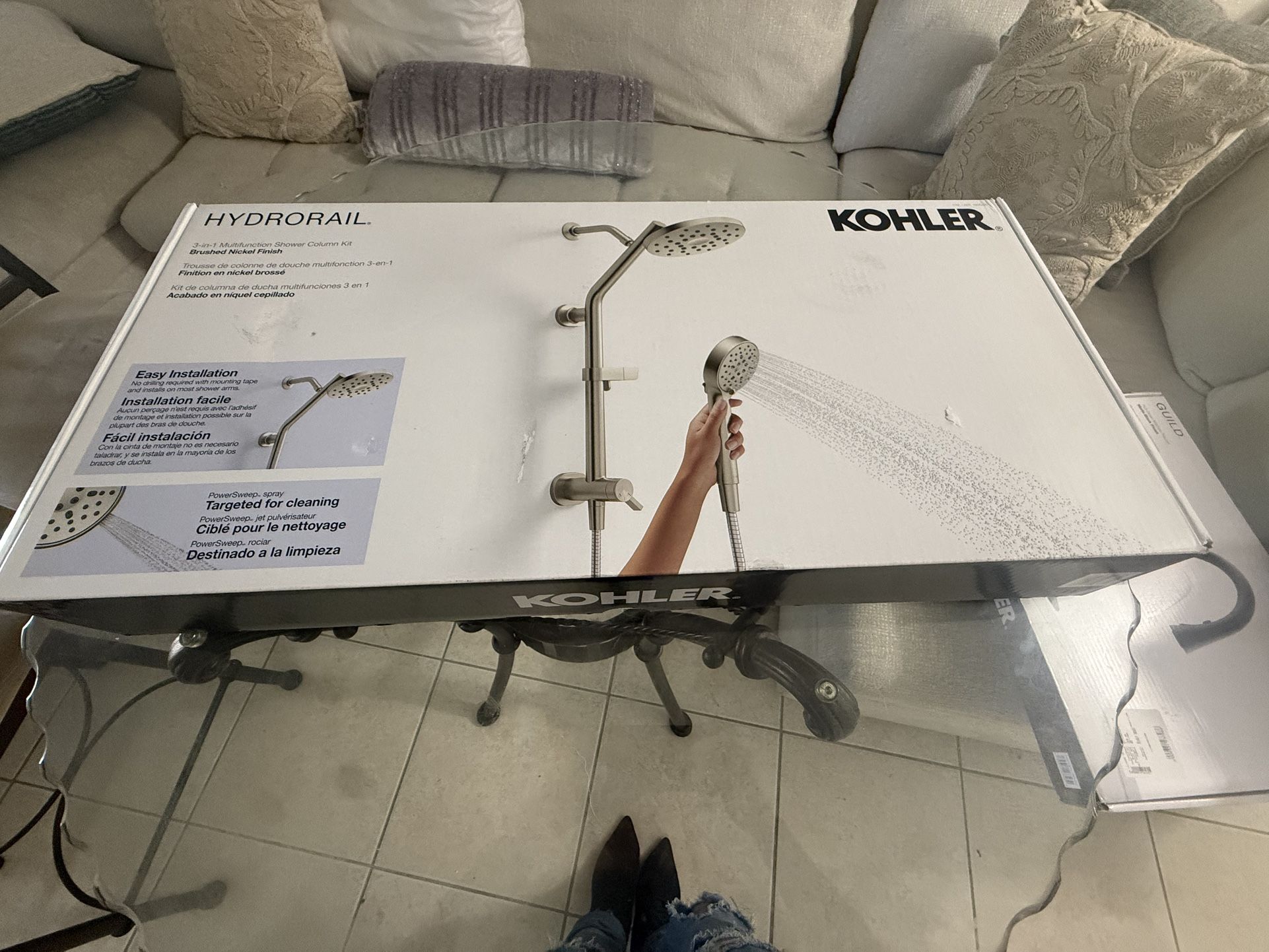 HYDRORAIL. 3-in-1 Multifunction Shower Column Kit Brushed Nickel Finish Trousse de colonne de douche multifonction 3-en-1 Finition en nickel brossé Kit de columna de ducha multifunciones 3 en 1 Acabado en níquel cepillado Easy Installation No drilling required with mounting tape and installs on most shower arms. Installation facile Aucun perçage n'est requis avec l'adhésif de montage et installation possible sur la plupart des bras de douche. Fácil instalación Con la cinta de montaje no es necesario taladrar, y se instala en la mayoría de los brazos de ducha. PowerSweep. spray Targeted for cleaning PowerSweep. jet pulvérisateur Ciblé pour le nettoyage PowerSweep. rociar Destinado a la limpieza