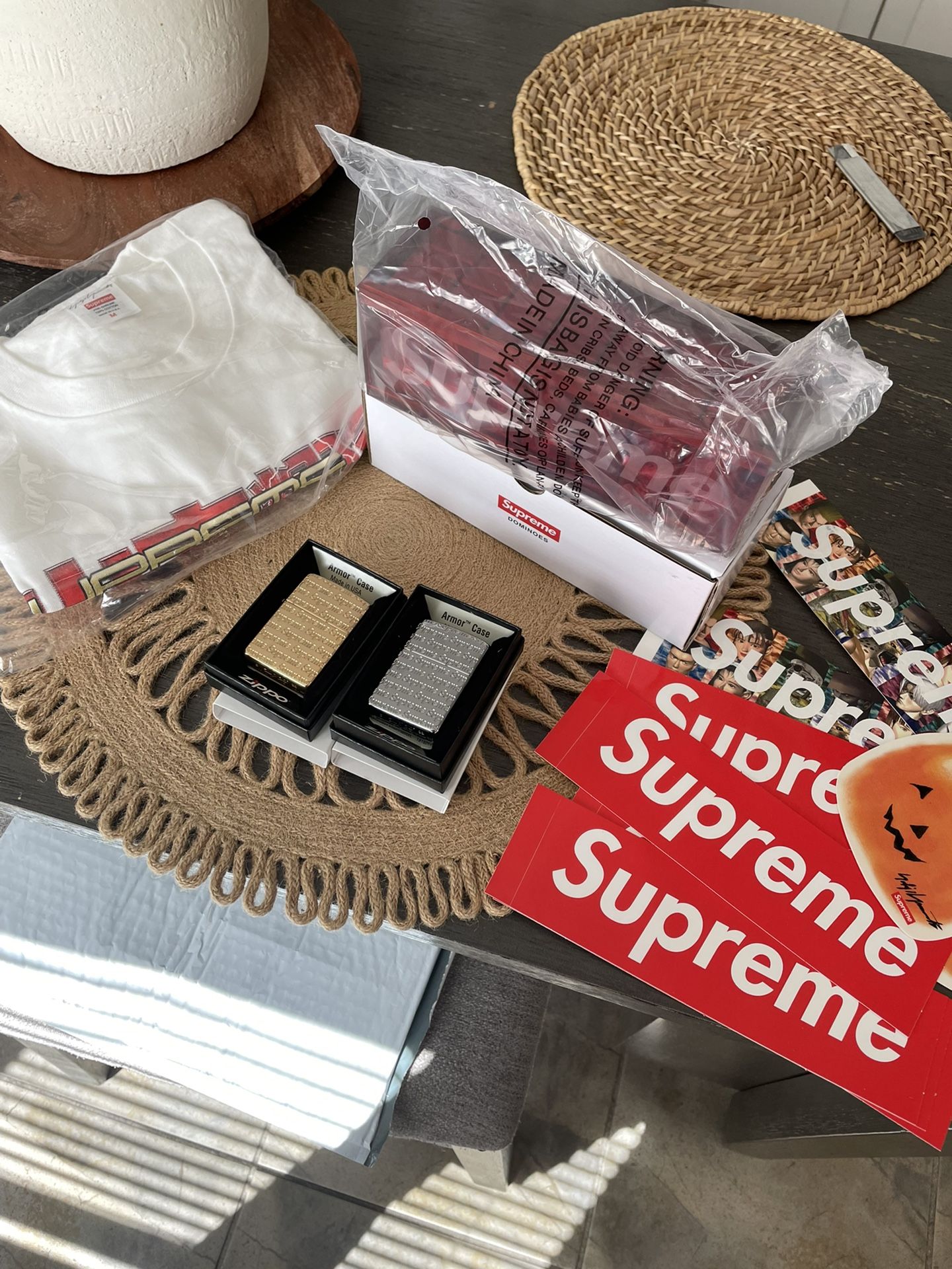 Supreme Lot Accesories And M Tee. Brand new. 100% og all. Pick up location hicksville. NO TRADES Aluminum domino set $220 Tekken white tee M $80 Engraved zippo gold $90 Engraved zippo silver $90
