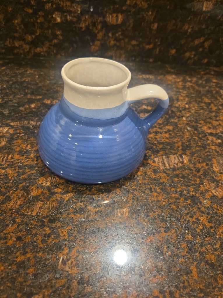 Modern stoneware mug or small pitcher in blue and cream glaze. Rustic farmhouse look. Unmarked. Approx. 4” tall. Very good condition with light base wear only.