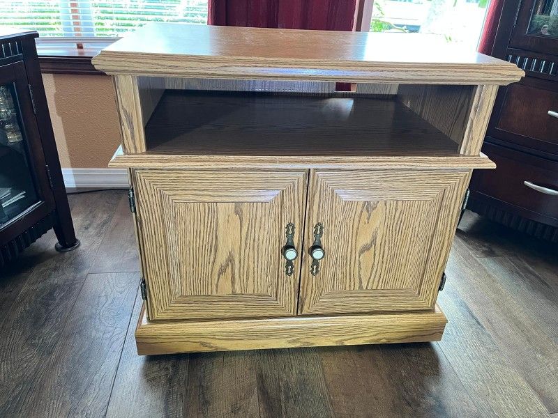 A practically new office table, or end table set on rolling casters. Made of wood, and is quite functional, with a surface large enough for a printer, or other electronics, modum, etc. Also a lower cabinet with shelf. Measures 29.5" length, 19" width, and 28" hight.