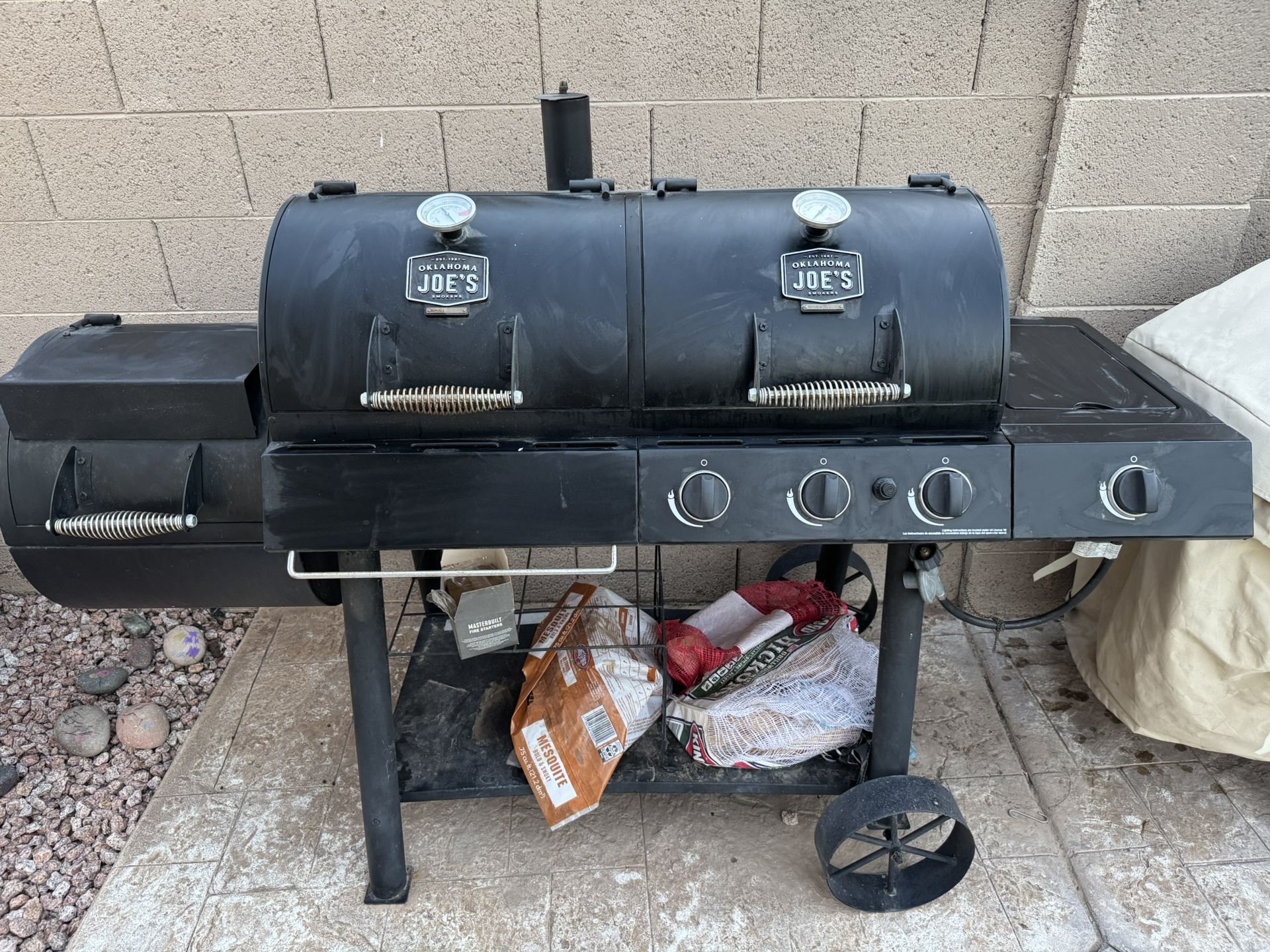 Oklahoma Joe’s smoker grill combo. Comes with the cover and some leftover wood.