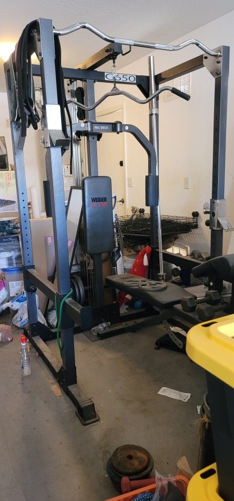 Squat/bench with cables and chest flies and adjustable bench with Olympic barbell and multiple weights 2 45s, 3-4 25s, 4-5 10s, 2-3 5s, 2 2.5s and cable attachment easy curl bar ( Bench not included)