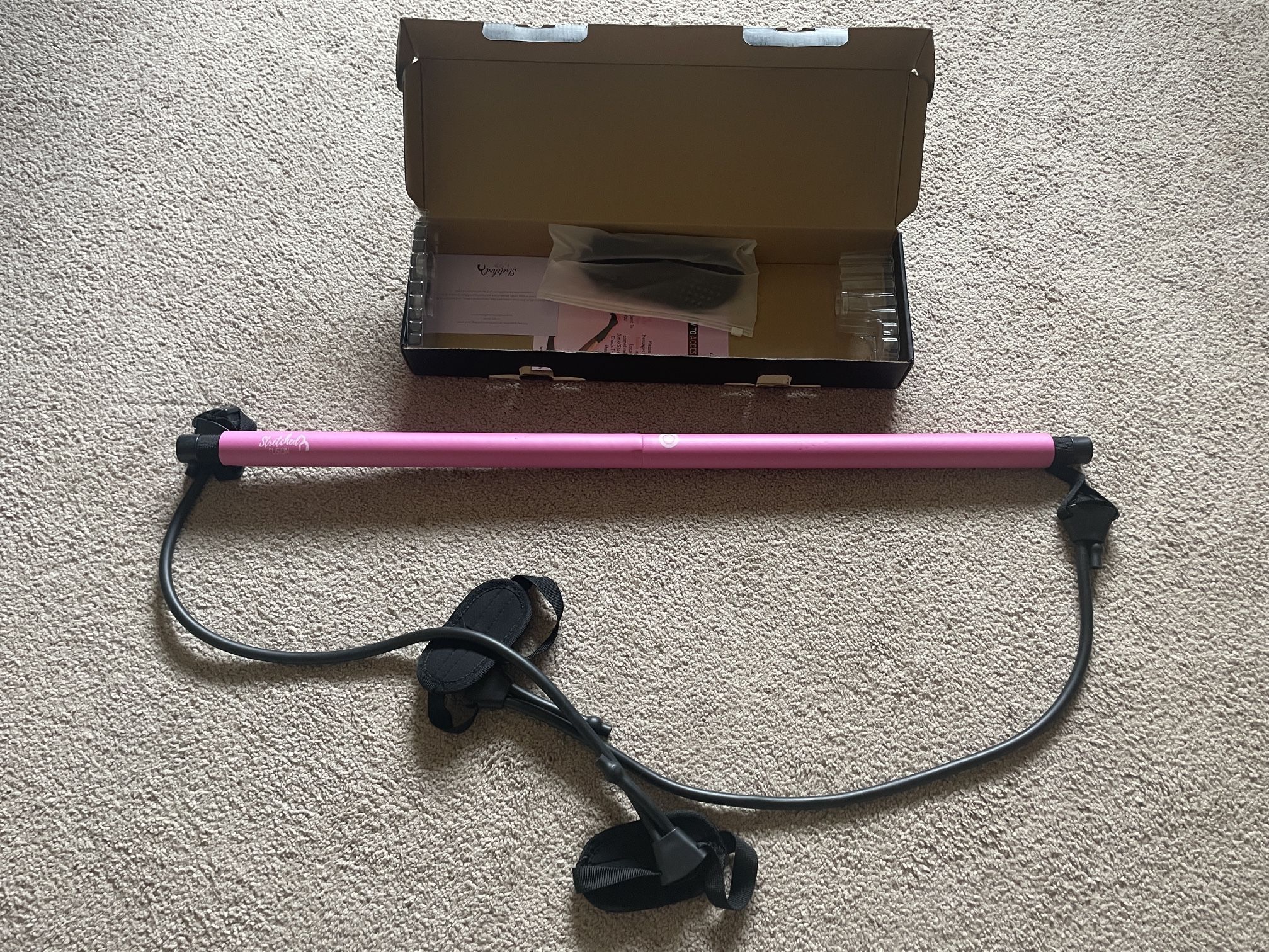Pilates bar from stretched fusion. Easy workouts at home. You can pay for subscriptions through their website or watch free classes on YouTube. Easy to use for any body type and skill level. Comes with grippy socks.