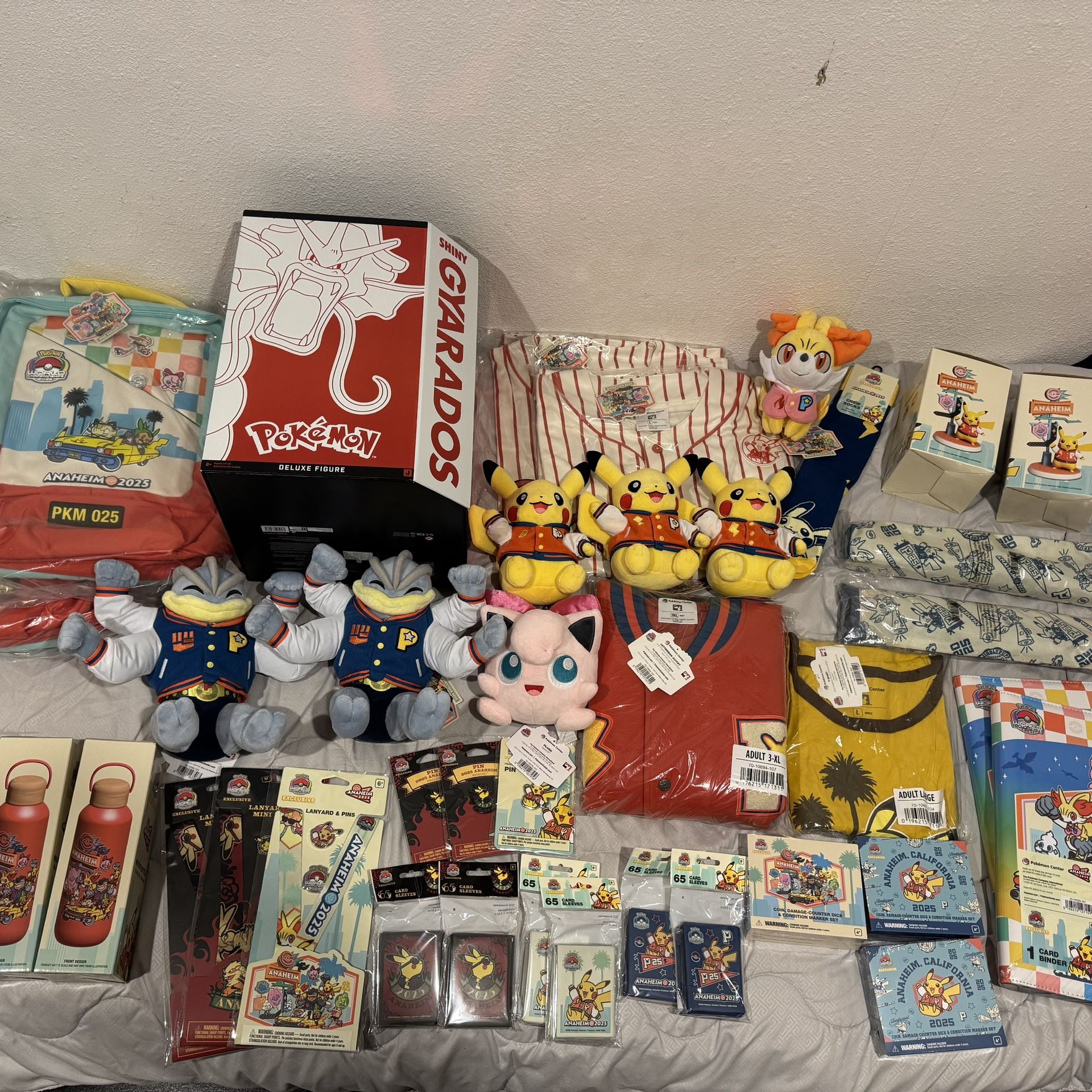 WC25 GYARADOS ACTION FIGURE - $225 (SOLD) 2x WC25 PIKACHU BACKPACK - $70 WC25 LETTERMAN JACKET 3XL - $175 (SOLD) 2x WC25 PIKACHU FIGURE - $40 WC25 PIKACHU BASEBALL JERSEY L&M (one each)- $225 (SOLD) 2x WC25 PLAYMAT & BAG - $45 WC25 JIGGLYPUFF PLUSH - $40 WC25 FENNEKIN PLUSH - $40 3x WC25 PIKACHU PLUSH - $50 2x WC25 MACHAMP PLUSH - $65 2x WC25 PIKACHU CARD SLEEVES-SOCAL - $20 2x WC25 PIKACHU CARD SLEEVES-ROCKABILLY - $20 2x WC25 PIKACHU CARD SLEEVES-VARSITY - $20 2x WC25 PIKACHU CARD BINDERS - $70 4x WC25 CAR SCENE WATER BOTTLE - $50 WC25 PIKACHU TEE - $40 WC25 PIKACHU CREW SOCKS - $20 2x WC25 PIKACHU MINI PIN & LANYARD SET- ROCKABILLY - $40 WC25 PIKACHU PIN & LANYARD SET-VARSITY - $50 WC25 CAR SCENE COIN & MARKER SET-SOCAL - $60 2x WC25 PIKACHU COIN & MARKER SET-VARSITY - $75 WC25 PIKACHU PIN-PRIMARY - $25 2x WC25 PIKACHU PIN-ROCKABILLY - $25