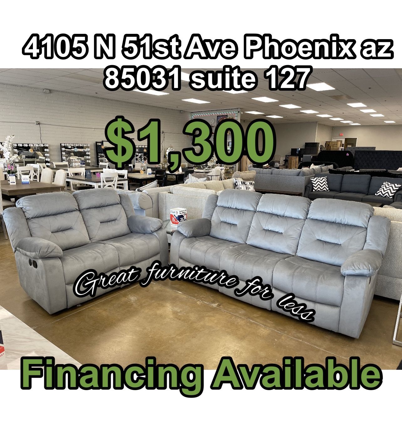 Great furniture for less 4105 N 51st ave phoenix az 85031 suite #127 ☎️ 6️⃣0️⃣2️⃣🧲4️⃣1️⃣9️⃣🧲8️⃣7️⃣5️⃣1️⃣ ☎️ 4️⃣8️⃣0️⃣🧲9️⃣3️⃣0️⃣🧲6️⃣0️⃣7️⃣2️⃣ ✅✅✅FINANCING AVAILABLE ✅✅✅ ⏰Store Hours 10:00 am to 8:00 pm⏰ ✅Bedroom sets ✅impressions vanity ✅bunk beds ✅sectional ✅Dining table sets ✅bed frame ✅sofa and loveseat