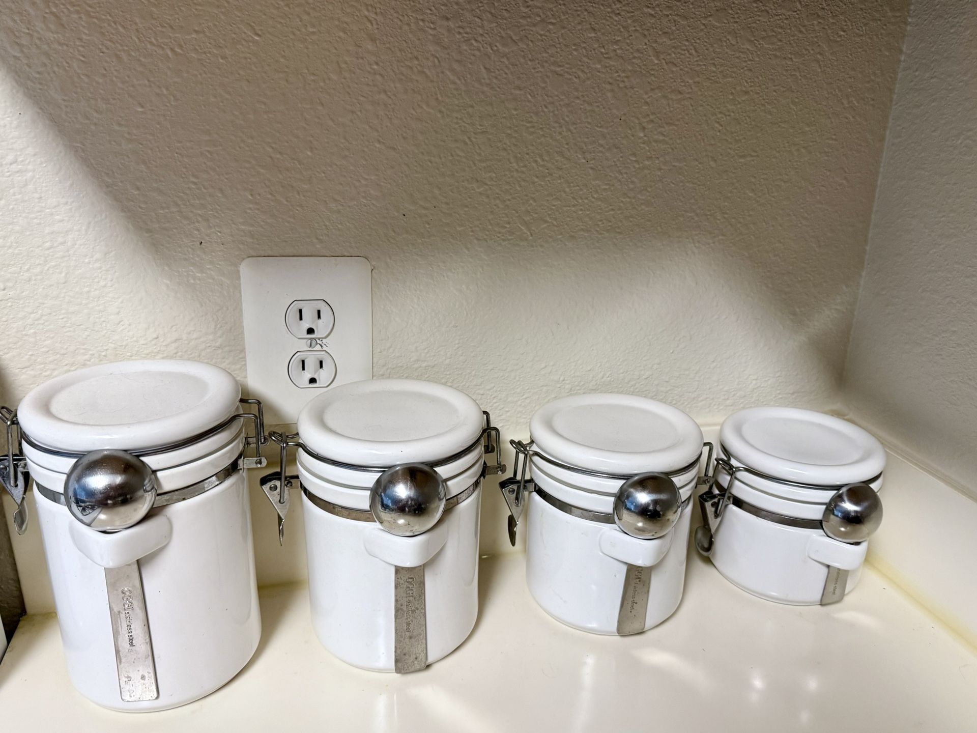 Set of four white canisters with stainless steel scoops