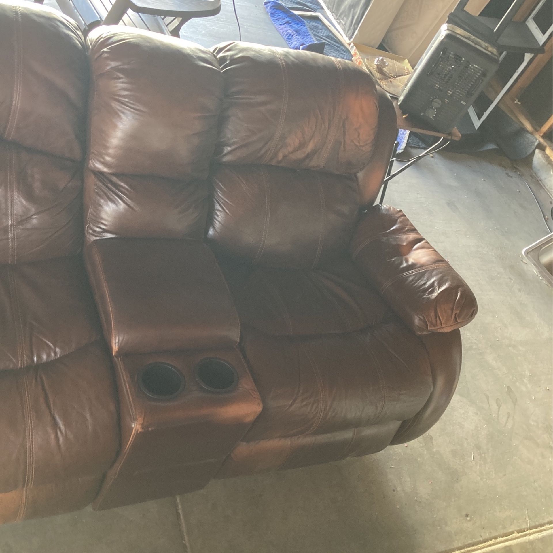 This is an extremely comfortable rocker love seat. Made with genuine leather, you will feel the difference. In a pet fee home and cigarette free. Leather fading in some spots but overall a great love seat. Retails $2500 Located at 67th ave and bell rd