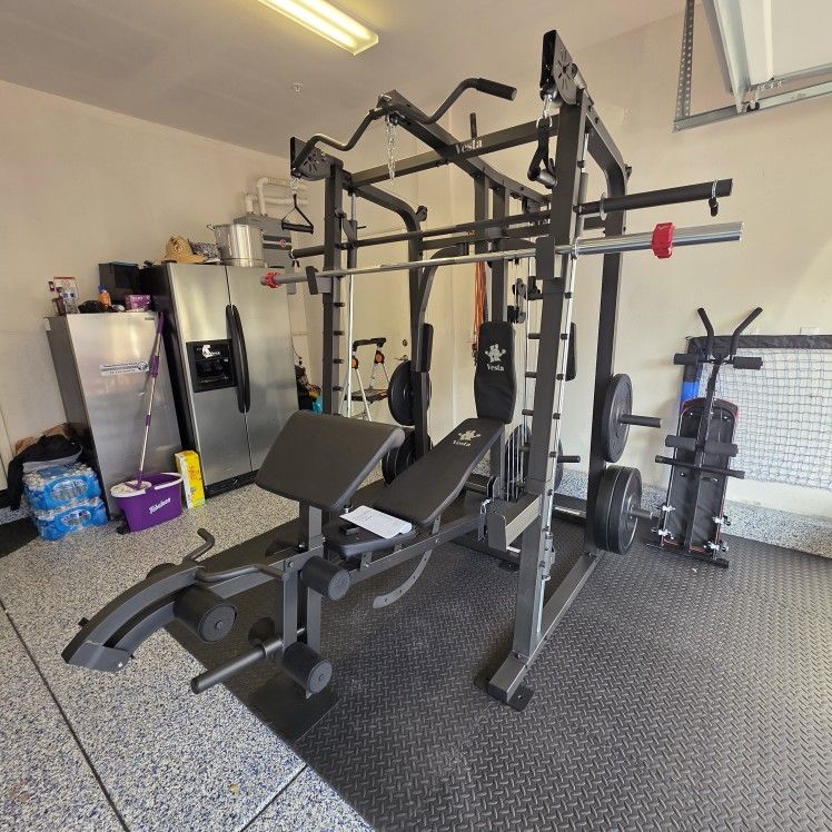 FREE DELIVERY 🚚 INSTALLATION AT EXTRA COST $$$ SHOWROOM AVAILABLE! NEW IN BOX! Need more photos let me know. Also have a Video available! 📷 《Offer only includes》 ✅️Vesta Smith Machine Sm2001 w all accessories and cable Attachments ✅️Multi-use Adjustable bench w/ leg workout station and precher station for biceps 💪 ‼️WEIGHTS AND EXTRA BARBELL ARE NOT INCLUDED ‼️ Vesta Sm2001 Smith Machine accessories and features ! Includes -- -- Hooks -- Spotter Arms -- 2 top side pulleys -- 1 Bottom back pulley -- 1 top center pulley -- Smith Barbell w/ saftey hooks! -- 2 D handles -- Ankle Strap -- Multi use Adjustable Bench with leg developer! Dimensions 86" Tall x 72" Wide x 83.5" Deep 🔴🔴🔴NEED BARBELL AND SET OF WEIGHTS 🔴🔴🔴 CHECK OUT THIS DEAL DOWN HERE! 🔥🔥$$$$$$1300 Bundle Deal 🔥🔥 ✅️Vesta Smith Machine SM2001 ✅️ Multi use Adjustable bench w/ leg developer ✅️230lbs Bumper Weights 45s/35s/25s/10s ✅️7Ft 45lbs Olympic Barbell w/ pair of clips! 🚛FREE DELIVERY 🚚 Intrested in more gym equipment shoot me a message! I can Help you Build Your Home Gym! Dumbells, kettle bells, more squat racks and Smith machines available