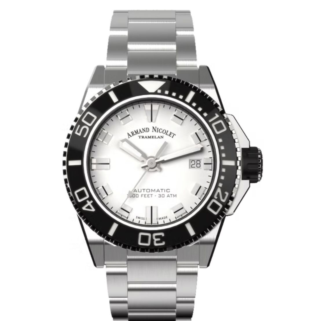 Key Details on the A481AGN-AG-MA2481AA NEVER OPENED and still in vacuum seal bag. Original Boxing and tag • Model: Armand Nicolet JS9-41 • Movement: Automatic Calibre AN200 (based on ETA 2824-2 or SW-200, modified by Armand Nicolet) Armand Nicolet • Functions: Date complication, luminous indexes and hands • Case: Stainless steel 316L, 41mm diameter, sapphire crystal with anti-glare treatment • Bezel: Turning black ceramic bezel • Water Resistance: 300m (diver’s watch) • Dial: Silver with luminous markers • Bracelet: Stainless steel