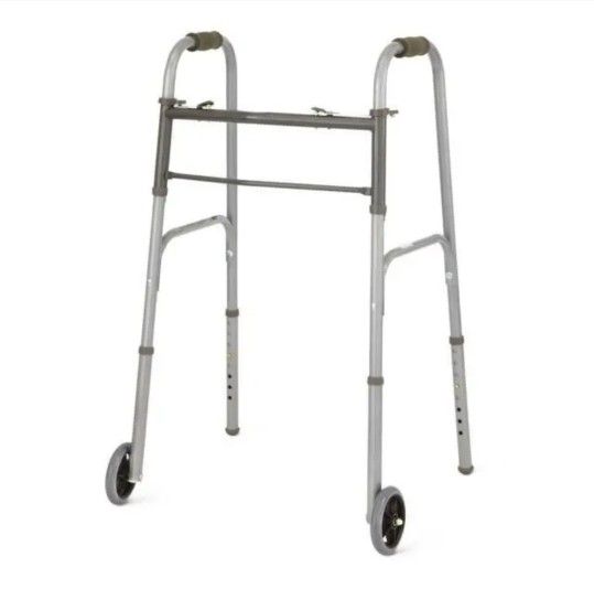Medline 2-Button Folding Walker (MDS86410W54B). New, no returns. Metallic color, 500 lb. capacity weight, 20 in. inside width, adjustable height, 2 button fold, 5 in. wheels.