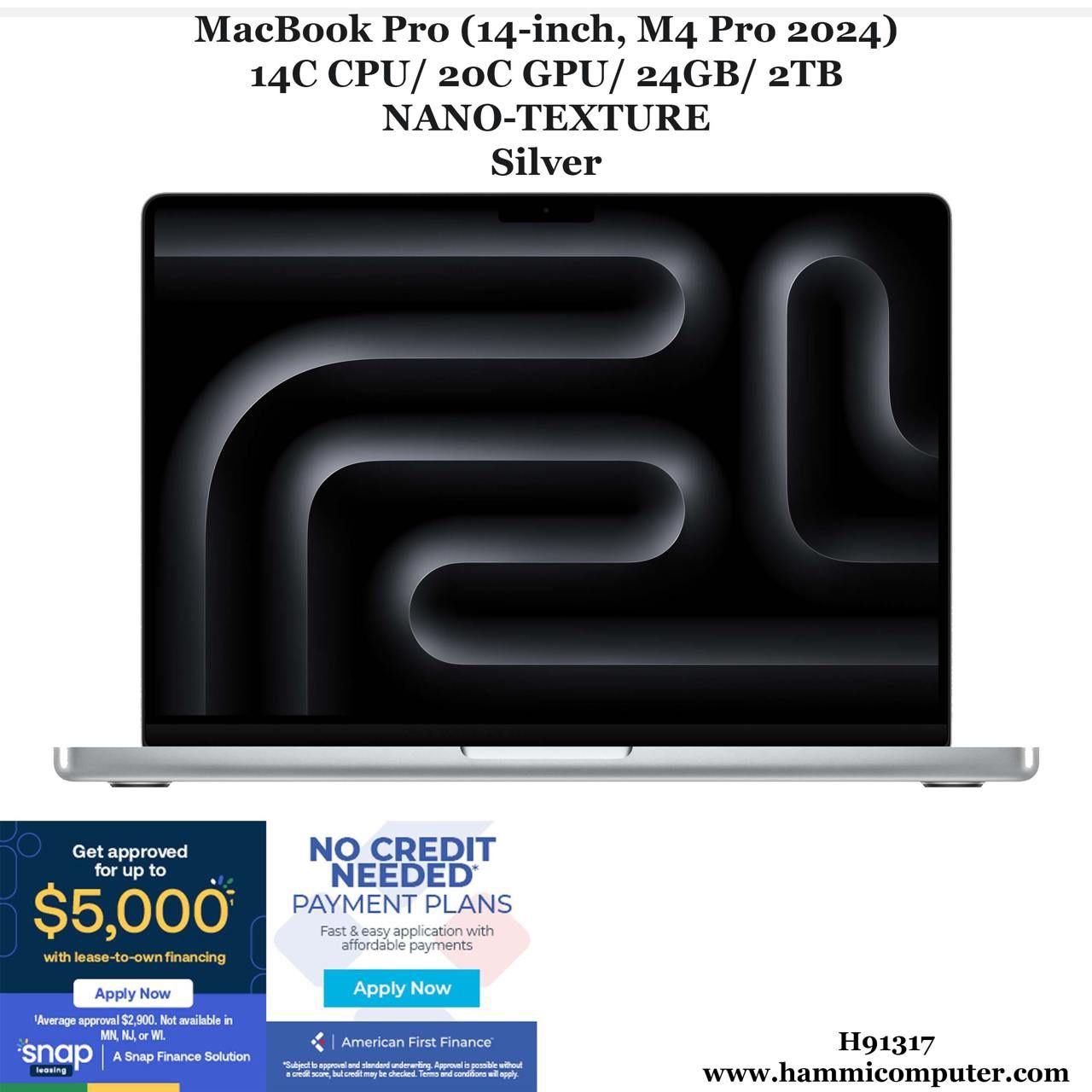 MacBook Pro (14-inch, M4 Pro 2024) H91317” Model: A3401 • Processor: Apple M4 Pro • Processor Speed: 14-Core • Storage: 2TB • RAM: 24GB • Graphics: Apple 20C • Screen Size: 14.2" • Condition: New • Serial Number: KTH54VCWW1 • NANO-TEXTURE • Color: Silver • https://offerup.com/redirect/?o=d3d3LmhhbW1pY29tcHV0ZXIuY29t • Finance Available