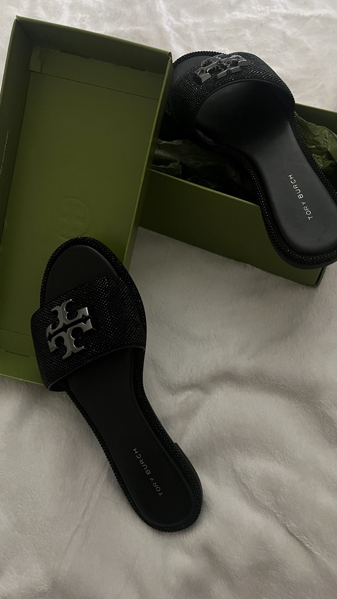 Size 6 Style is black everly slides, with rhinestones. Looks super pretty in the dark, in the sun, they sparkle in every lighting. They sell for $350+ in store, im asking for 250 but im willing to negotiate. Only worn once so they’re pretty new. Message me for any questions, negotiation, or if youre interested. Serious inquiries only! :)