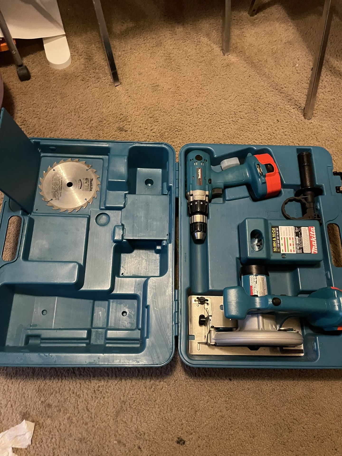 Has a wireless drill 2 rechargeable batteries and an electric saw with an extra blade.