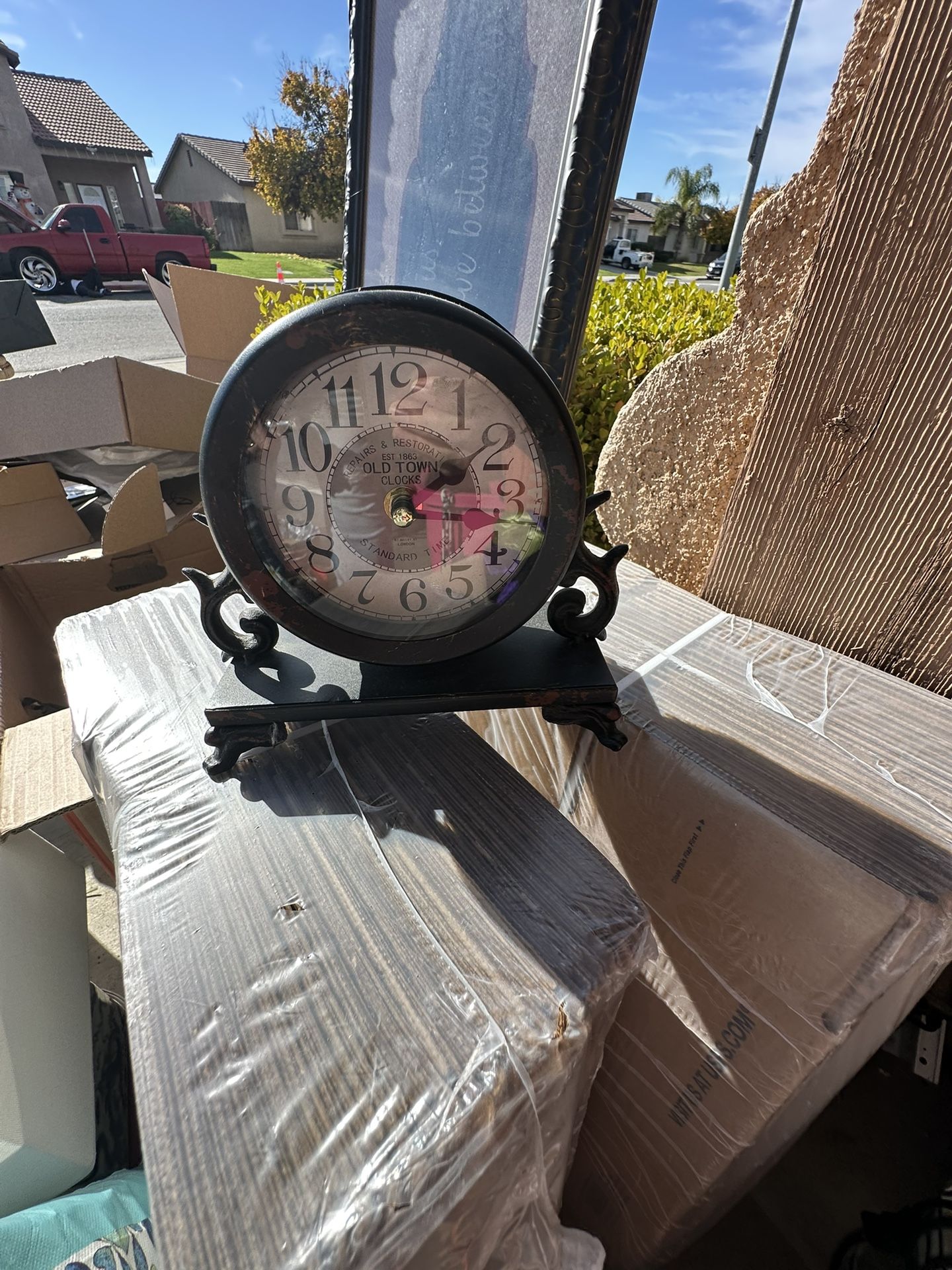 This is a black metal "Old Town Clocks" analog table clock with scroll accents